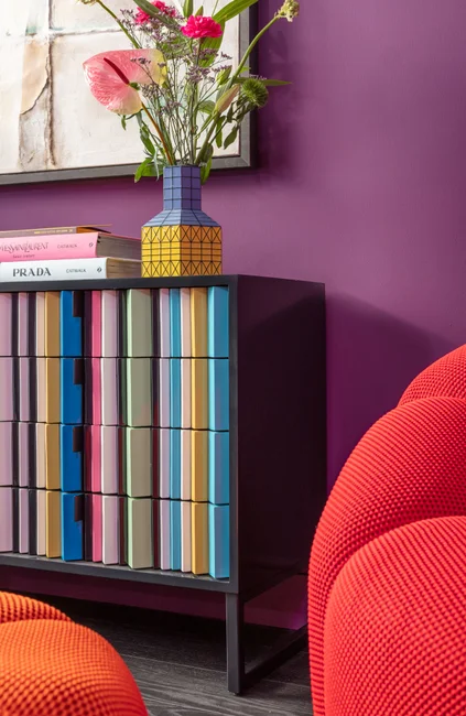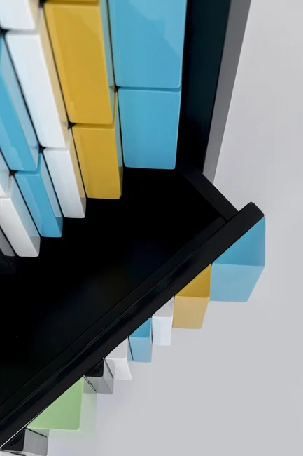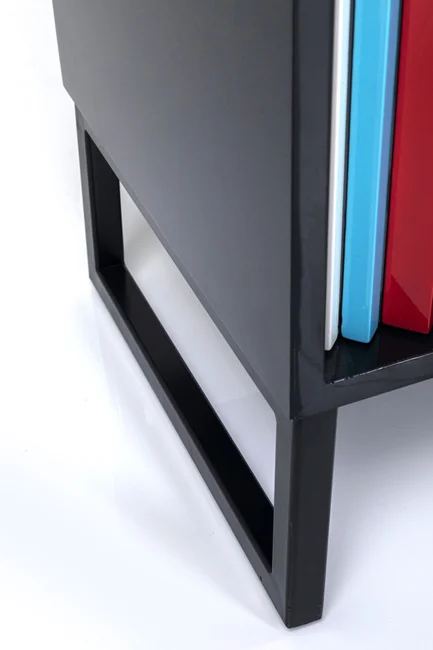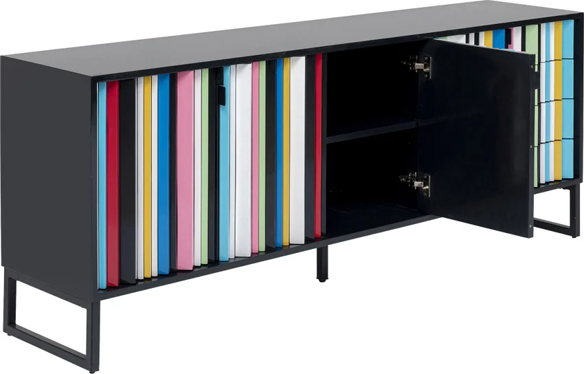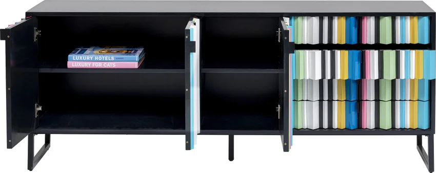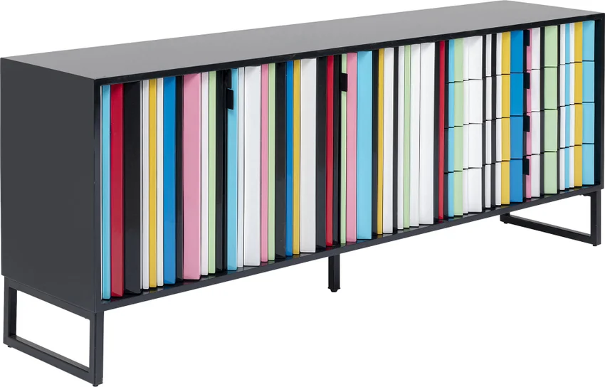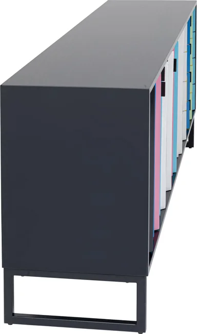 - Extraordinär skänk i storleken 74x186x40cm (H/B/D) med en svart ram och en färgstark, tredimensionell front
