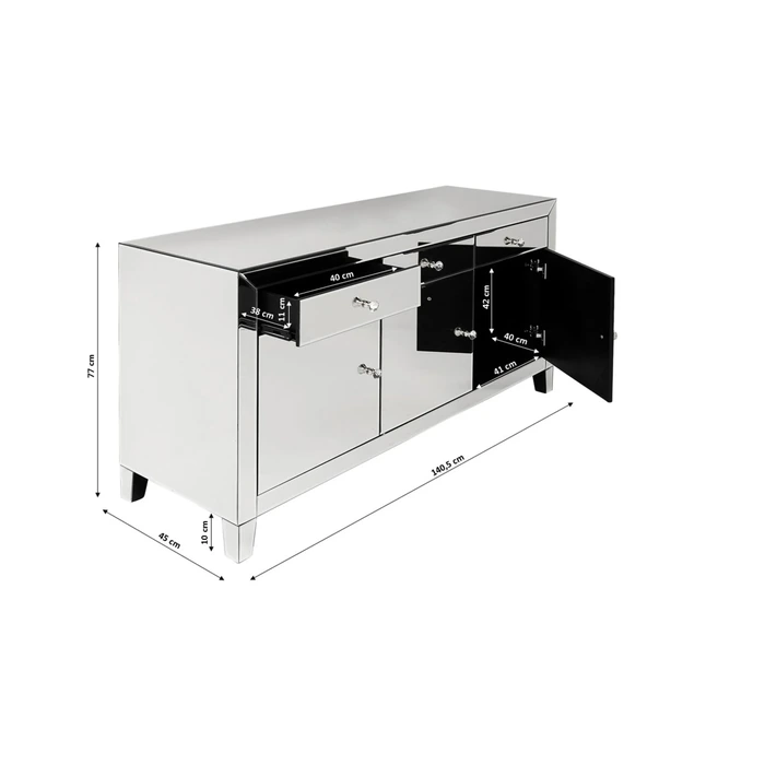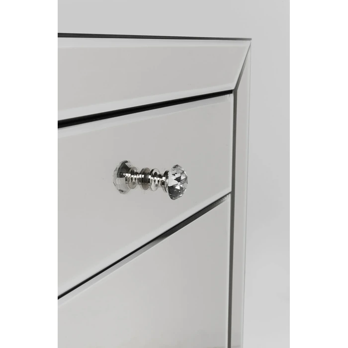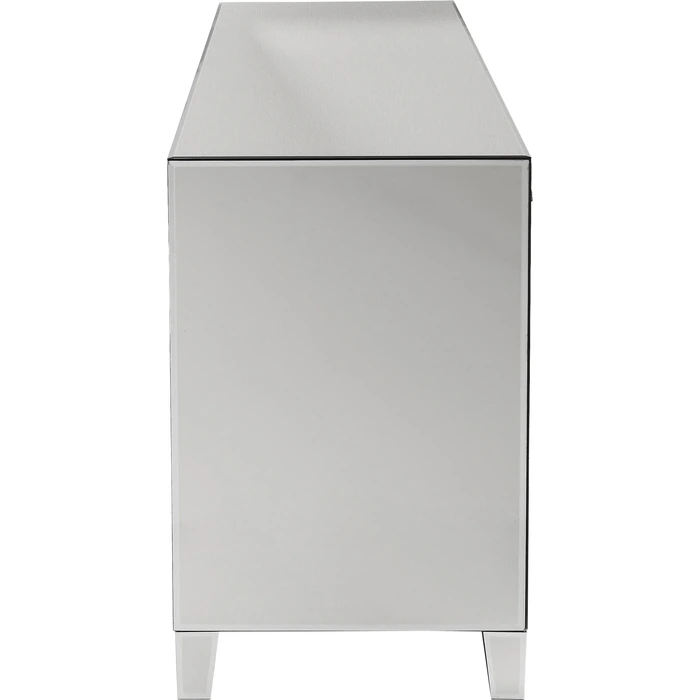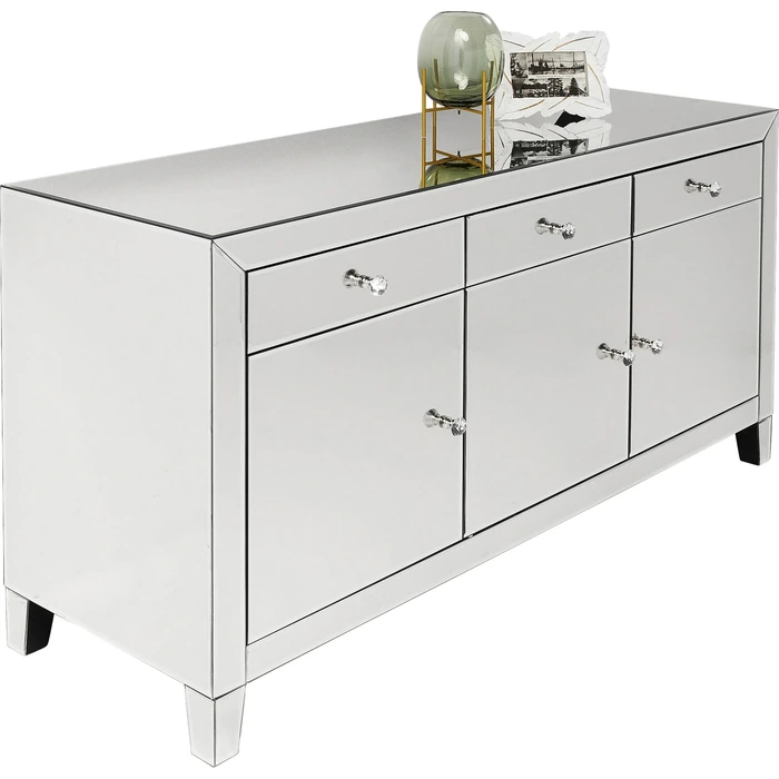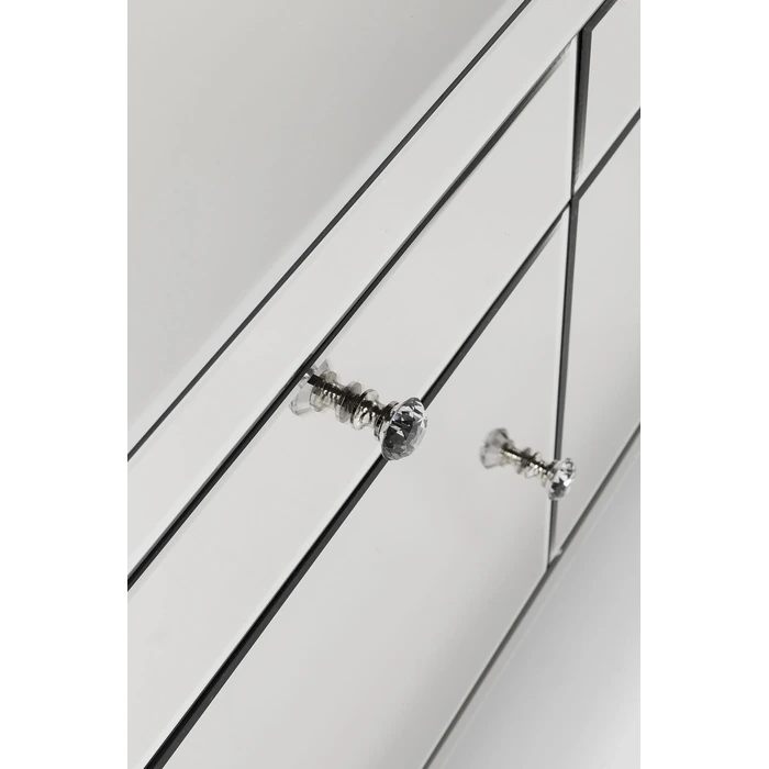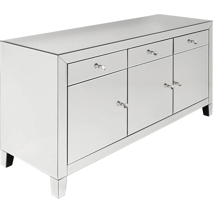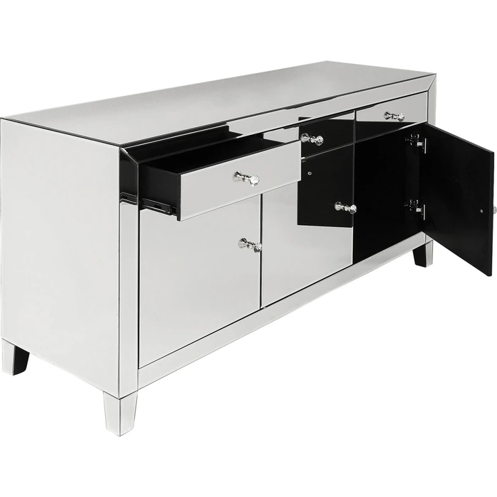 Bakom de stilrena dörrarna och i de rymliga lådorna döljer sig generöst med förvaring för servis, textilier eller vardagsföremål. Glasknopparna förstärker den eleganta känslan och ger en subtil kontrast till de speglande panelerna. Möbeln levereras färdigmonterad och fungerar lika bra som solitär blickpunkt som i kombination med andra möbler i samma stil.