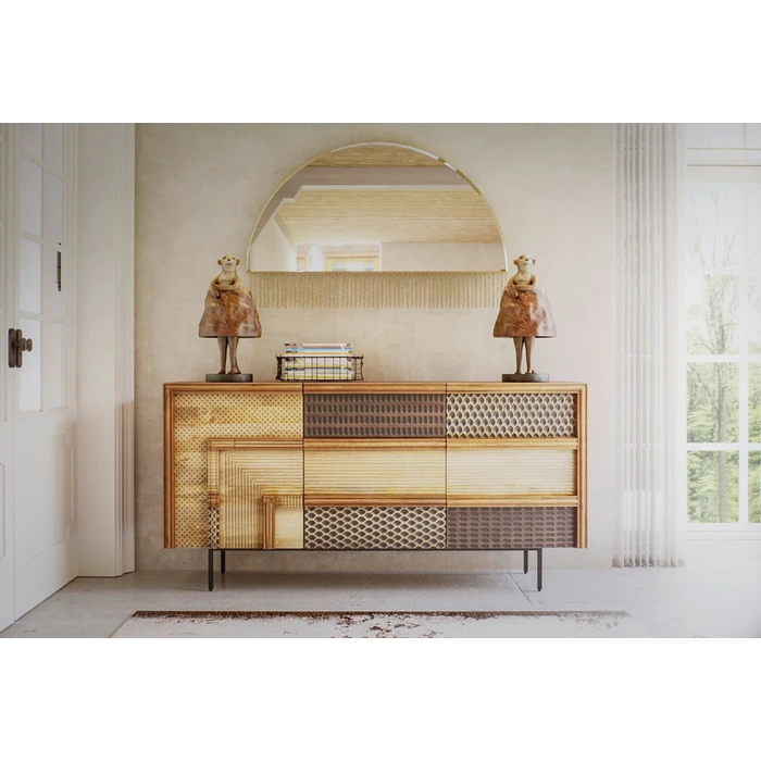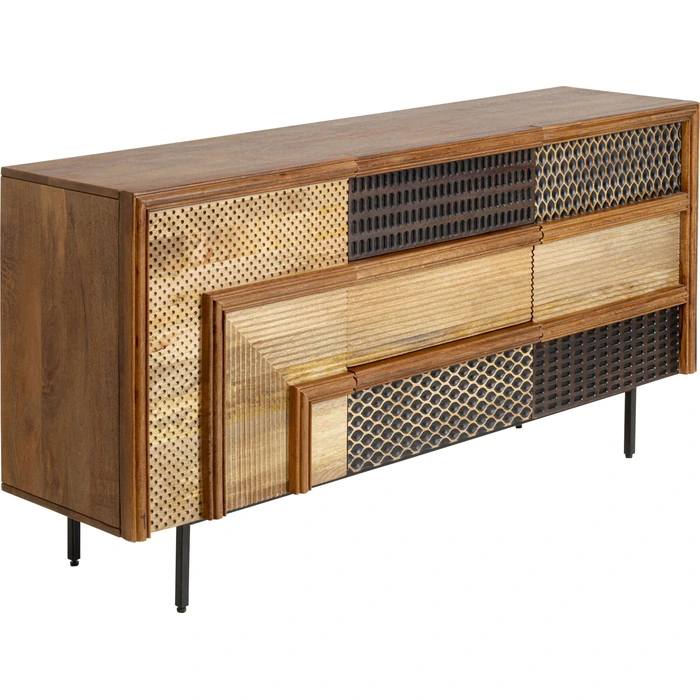 Rymligt sideboard i mangoträ med handarbetad front och mjukstängning – perfekt i vardagsrum eller matsal.