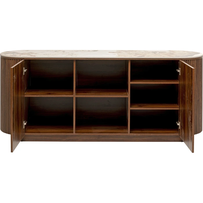 Sideboardet erbjuder gott om utrymme för förvaring av porslin, glas, textilier eller andra vardagsföremål. Den breda toppytan ger plats för lampor, konst eller dekorationer och gör möbeln till en central del av rummet. Perfekt för att skapa både ordning och stil i hemmet.