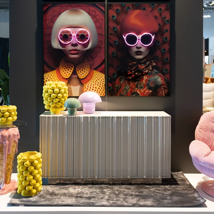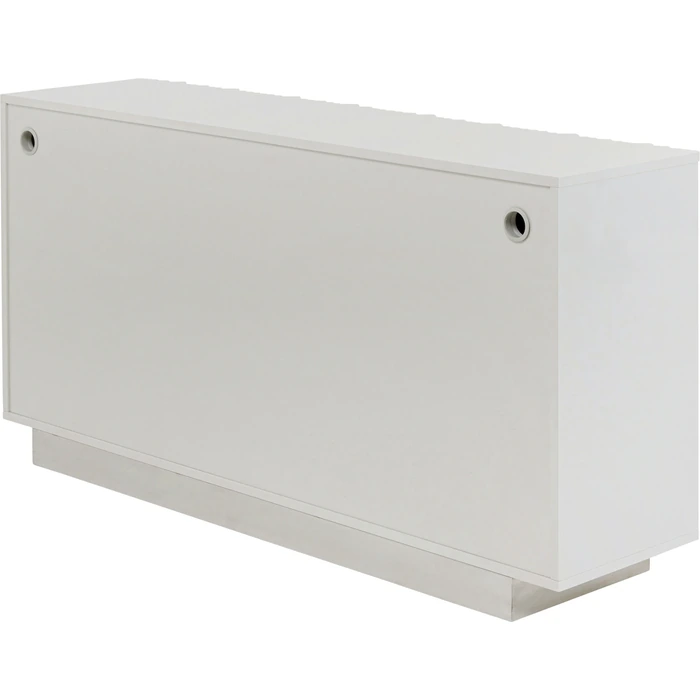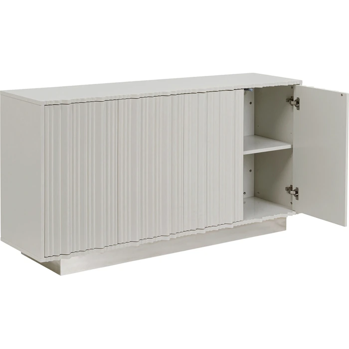 Invändigt erbjuder sideboardet generöst med förvaringsutrymme tack vare två höjdjusterbara hyllplan som gör det enkelt att organisera allt från böcker och porslin till textilier och vardagsföremål. Den polerade ramen i rostfritt stål skapar en elegant kontrast mot den mjuka färgsättningen och ger möbeln en lätt, nästan svävande känsla. Sideboardet gör sig särskilt bra i minimalistiska miljöer och tillsammans med glas, svartvita detaljer eller diskreta dekorationsobjekt.