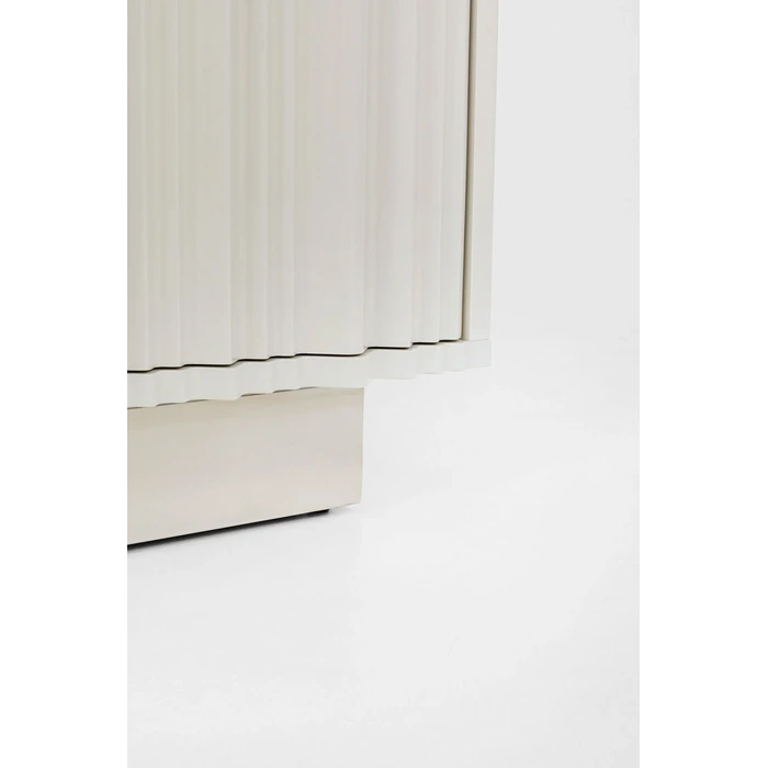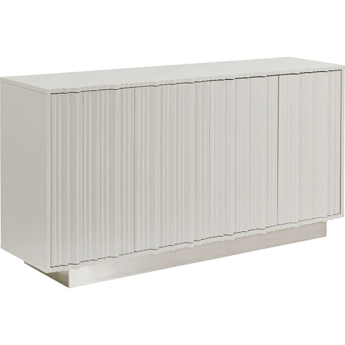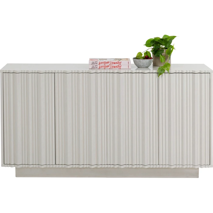 Sideboard Stucco White är ett modernt förvaringsmöbel som kombinerar funktionalitet med skulptural elegans. Den mjukt vågformade fronten i högblank lack skapar ett levande tredimensionellt uttryck som ger rummet djup och dynamik, samtidigt som den ljusgrå färgtonen bidrar till ett lugnt och sofistikerat helhetsintryck.