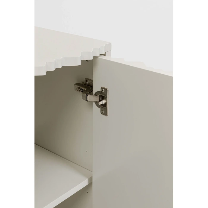 Modernt sideboard i ljusgrått med vågformad front och högblank yta.