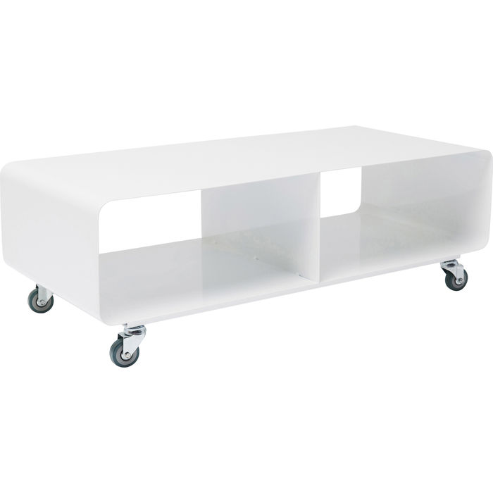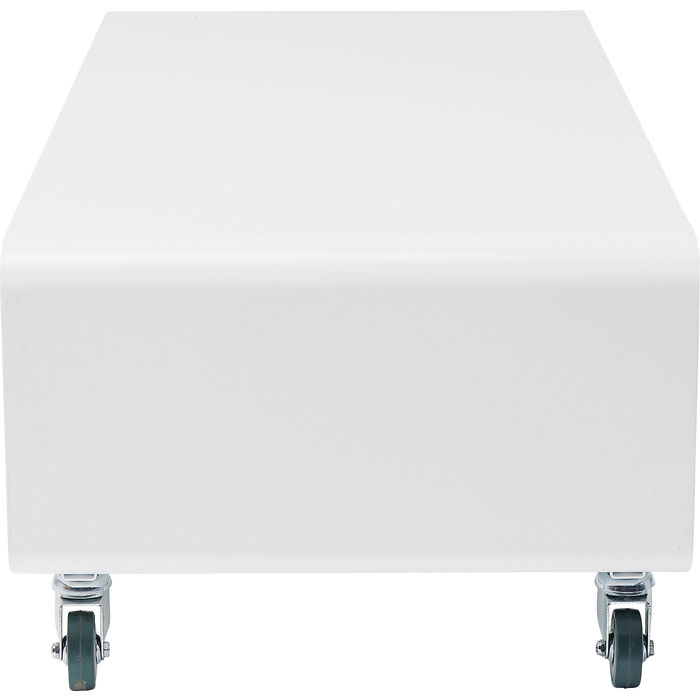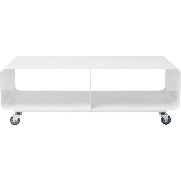 Snygg och stilren vit tv-bänk och förvaringsmöbel på hjul. Bänken är tillverkad i vitlackad stål med en strömlinjeformad design som ger en cool retro 70-tals känsla.