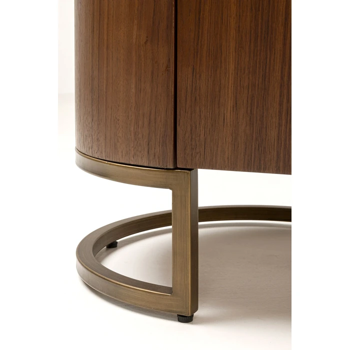 Exklusiv förvaring i valnöt och glas med modern metallbas – lyfter vardagsrum eller matsal med varm elegans.