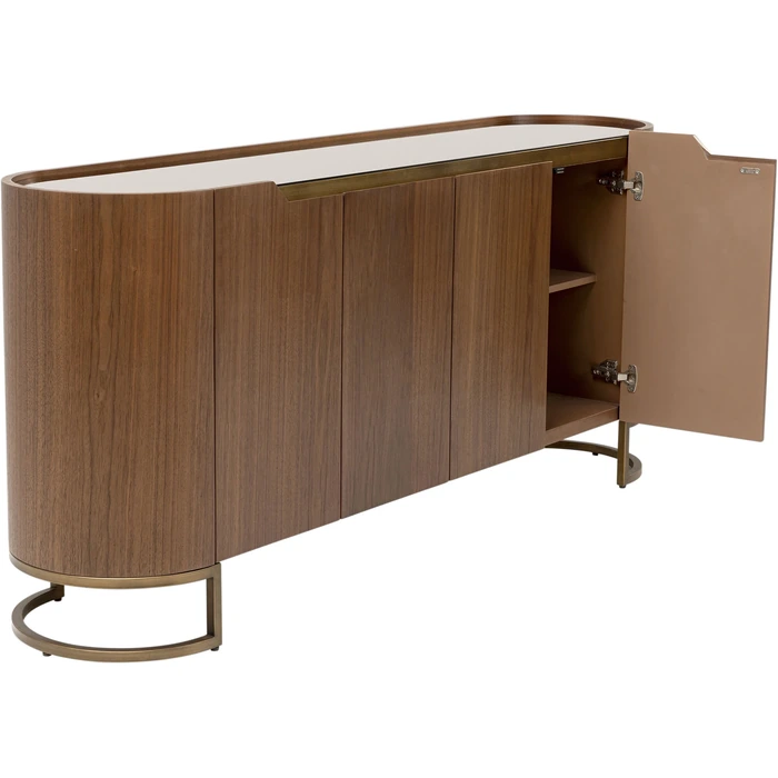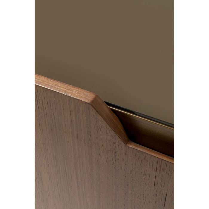 Ett stilrent förvaringsmöbel där varm valnötskaraktär möter mörkt glas och detaljer i metall. Den generösa bredden ger gott om plats för porslin, teknik och textilier.