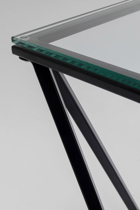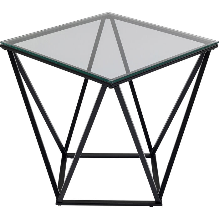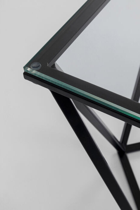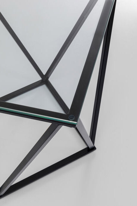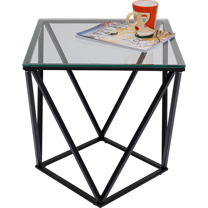 Läckert fyrkantigt sidobord med en geometrisk ram av svart stål och bordsskiva i glas.