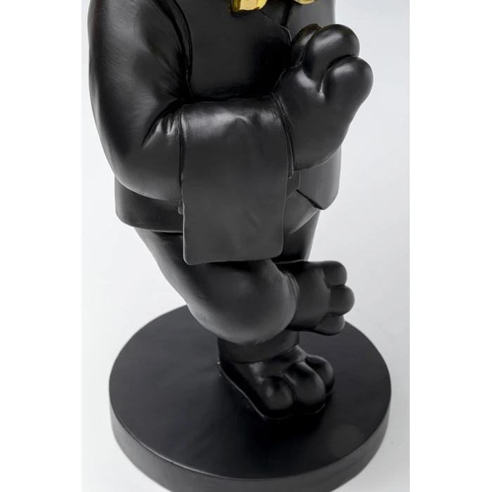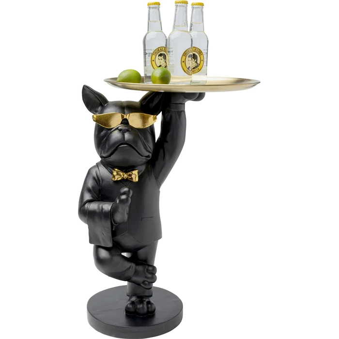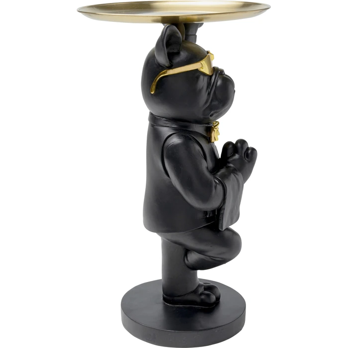 Skulpturalt sidobord med bulldog och metallbricka i svart och guld.