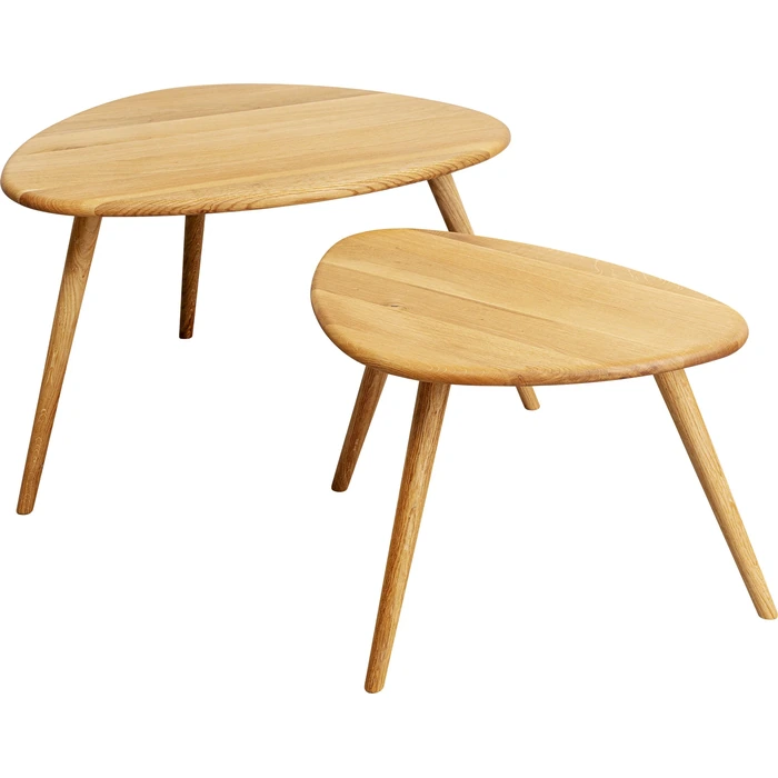 Set med två sidobord i oljad, massiv ek. De organiska formerna och de mjukt avrundade kanterna ger ett lätt och inbjudande uttryck.