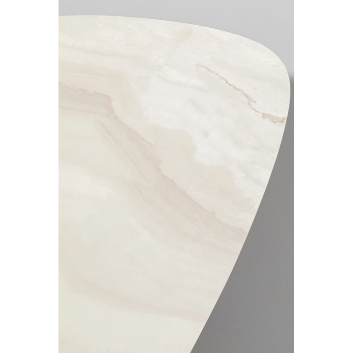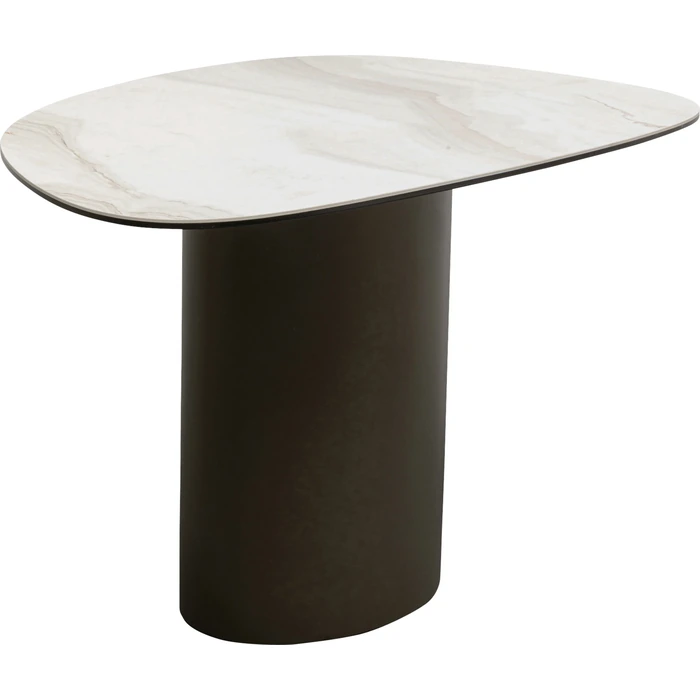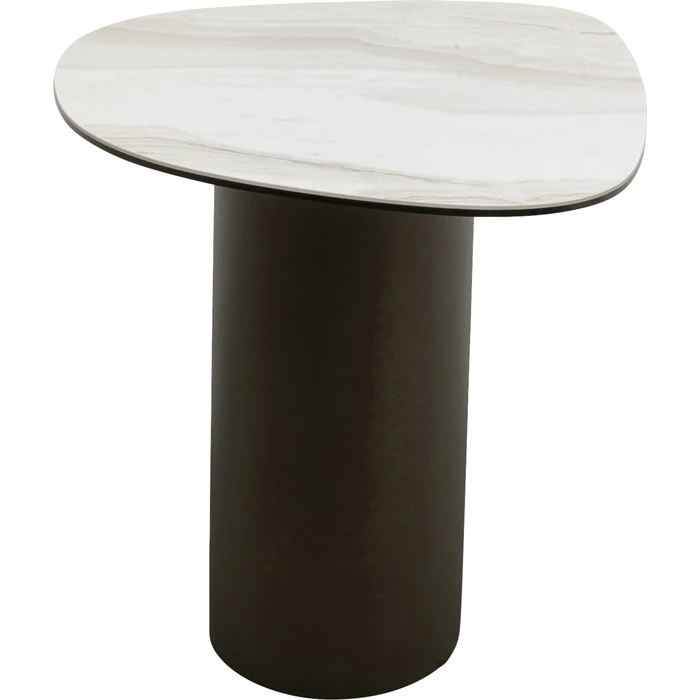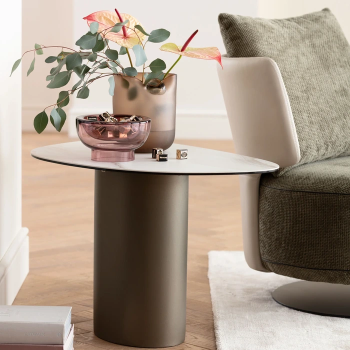 Sidobord med glas- och keramikskivor samt stålunderrede – robust, luftigt och lätt att placera.
