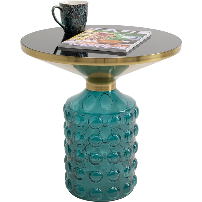 Runt sidobord i blått turkos glas med svart topp – en skulptural accent som lyfter soffhörnet.