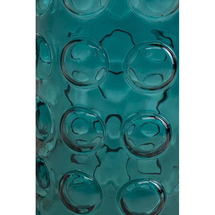 Cylinderformad glasbas med blå turkos bubbelstruktur och svart säkerhetsglasskiva med gulddetaljer.