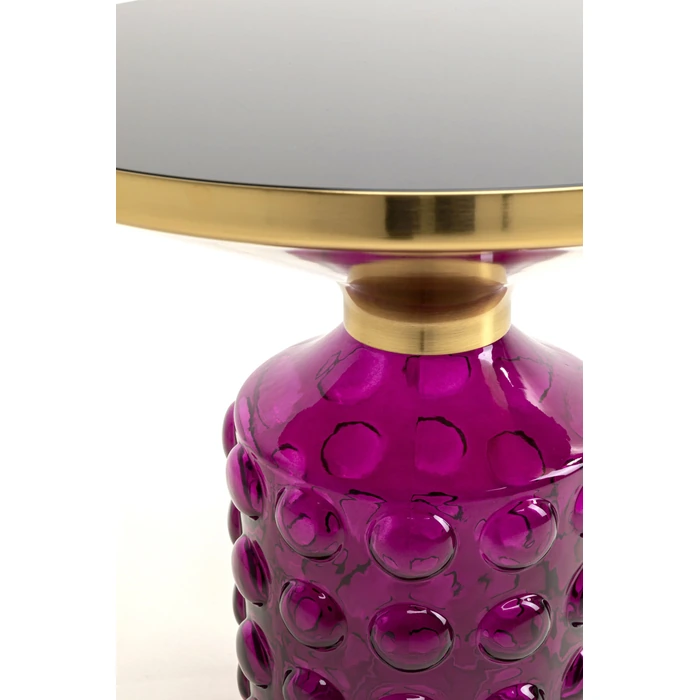 Runt sidobord i lila glas med svart topp – en skulptural accent som lyfter soffhörnet.