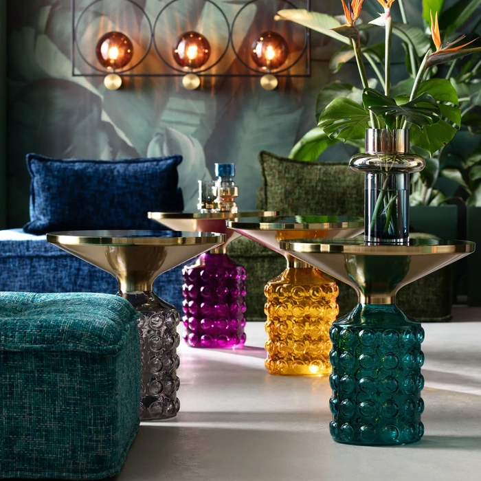 Runt sidobord i rökgrått glas med svart topp – en skulptural accent som lyfter soffhörnet.