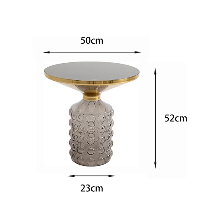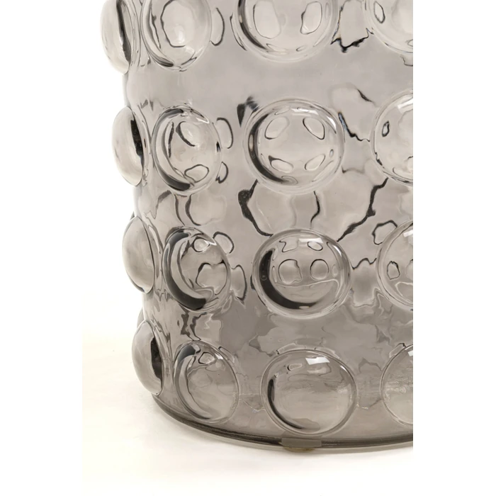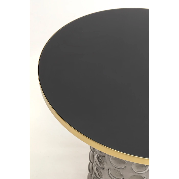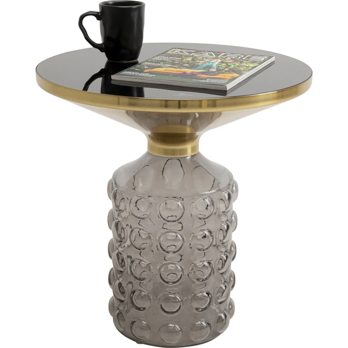 Cylinderformad grå glasbas med bubbelstruktur och svart säkerhetsglasskiva med gulddetaljer.