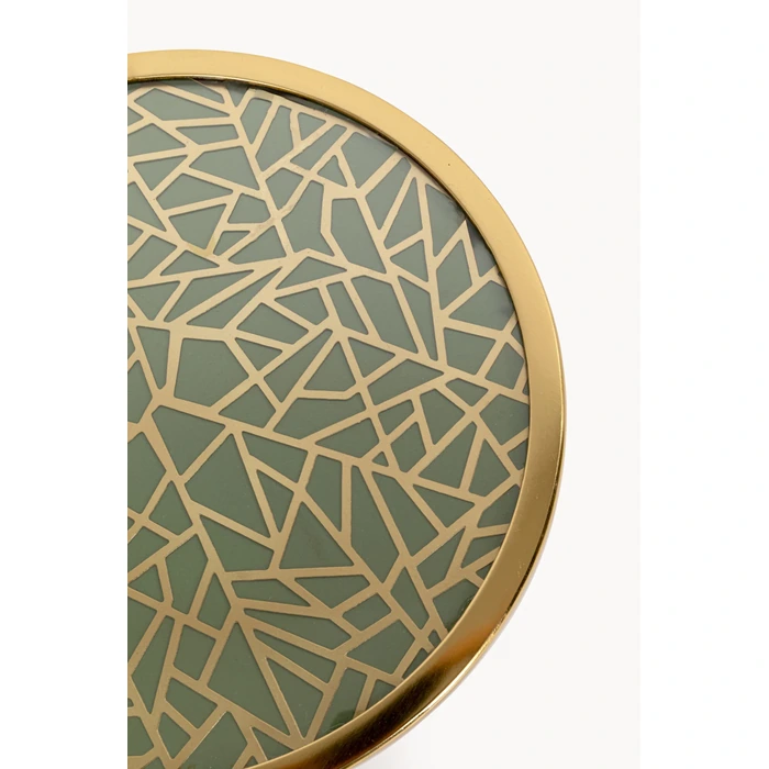 Litet sidobord i grönt med dekorativ yta och gulddetaljer.