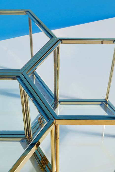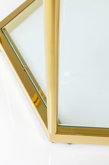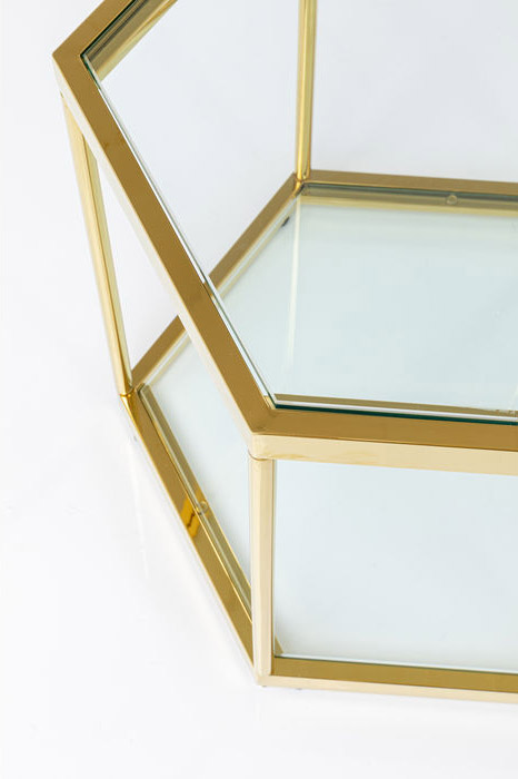 Riktigt trevlig litet sexkantigt bord i glas och guldfinish. Bordet passar både som sidobord men blir extra fint i grupp med flera ihop. I serien finns även ett lite högre bord om man vill skapa kontrast i höjd. Borden har även glas i botten som hylla för böcker, magasin m.m. Borden finns också i silverblank krom med glas.