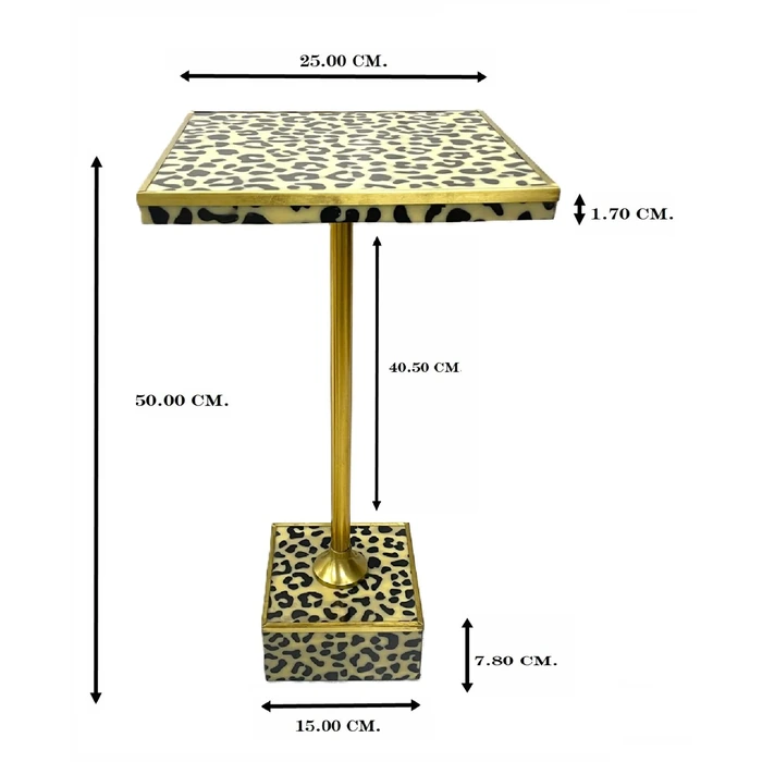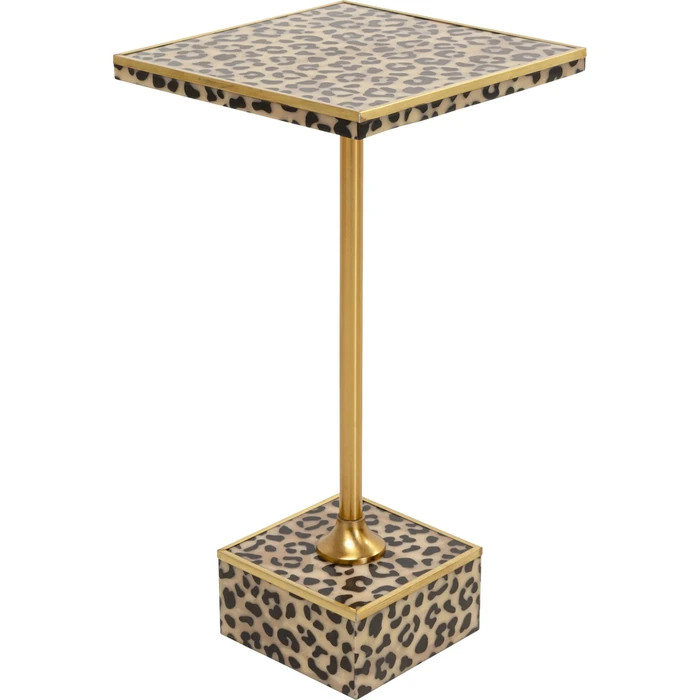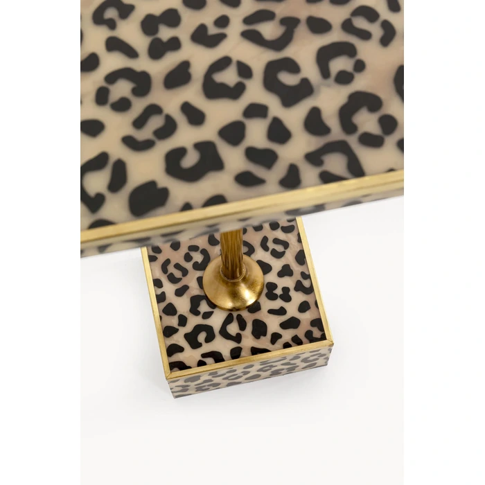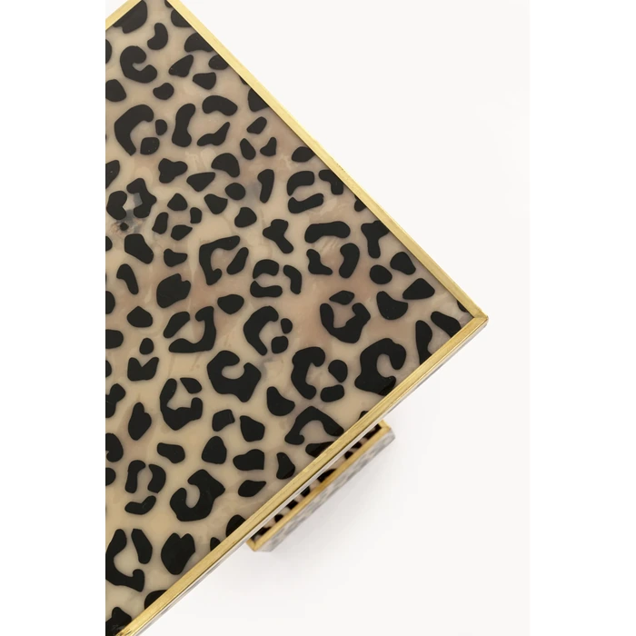 Litet sidobord med leopardmönster i brunt och gulddetaljer.