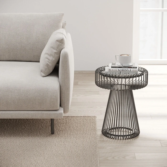Sidobord Lisboa – Svart, Ø38 cm är ett mångsidigt litet bord som ger en diskret, modern touch. Den slanka stålramen och den klara ESG‑glasskivan förstärker den lätta känslan och gör att bordet fungerar lika bra vid soffan som som nattduksbord.