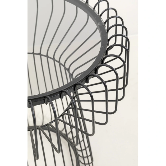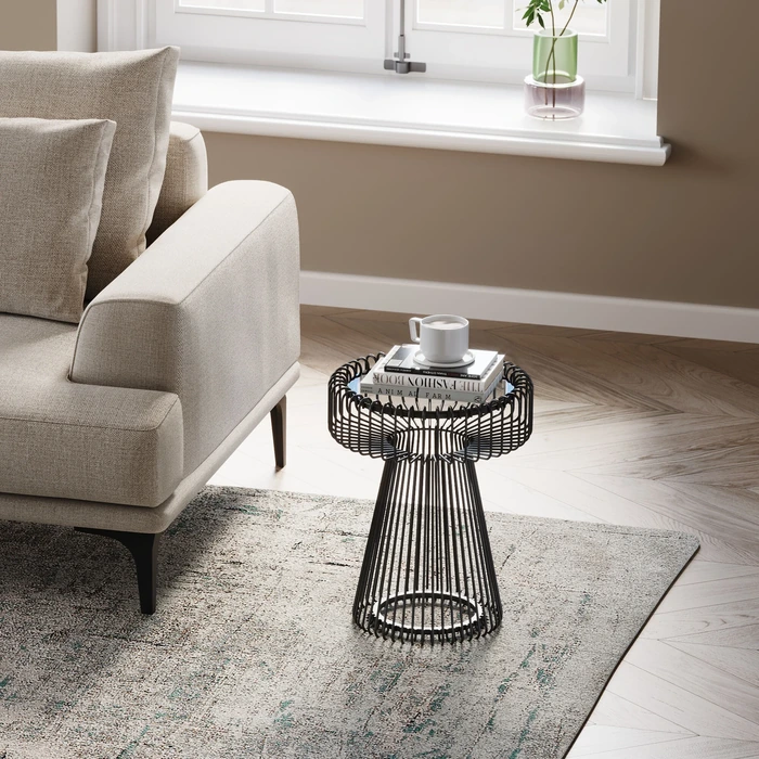 Runt sidobord i svart stål med klar glasskiva – kompakt, stilrent och lätt att placera.