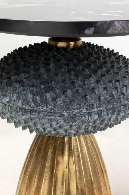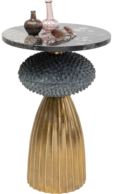 Detta flamboyanta sidobord är en designmöbel i en klass för sig. Toppen är gjord av sten, den gyllene basen är förfinad med mässing och den absoluta höjdpunkten dyker upp i mitten: den ovala sfären av pulverlackerad metall påminner om en kastanj och är svårslagen vad gäller prakt. Det lilla bordet bredvid din soffa som ett alternativ till ett soffbord eller som ett sängbord bredvid din säng kommer att få en stark huvudroll i vilket rum den än placeras i hemmet.