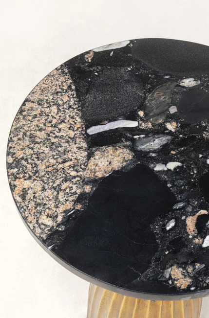 - Toppskivan är gjord av natursten och basen är avslutad med mässingfärg