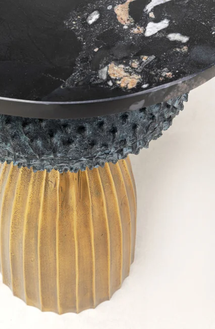 Material: Stomme: Aluminium, mässingspläterad. Bordsskiva: Natursten. 15mm tjocklek på panel. Aluminium, pulverlackerad. Handgjord, varje sidobord unikt. Delvis demonterad