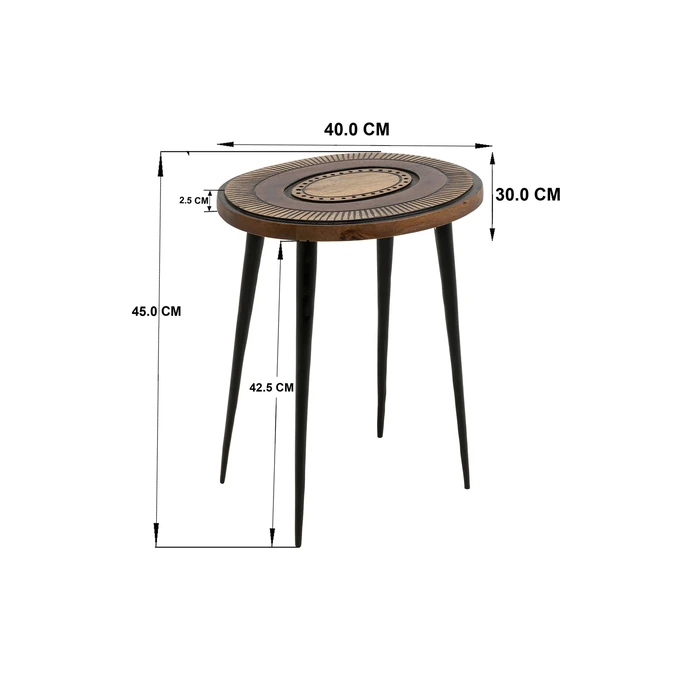 Sidobord Medina är ett uttrycksfullt litet bord som kombinerar orientaliska influenser med modern formgivning. Den ovala bordsskivan i massivt trä har en rikt dekorerad yta med fin struktur som för tankarna till traditionellt hantverk och ger möbeln en varm, konstnärlig karaktär.