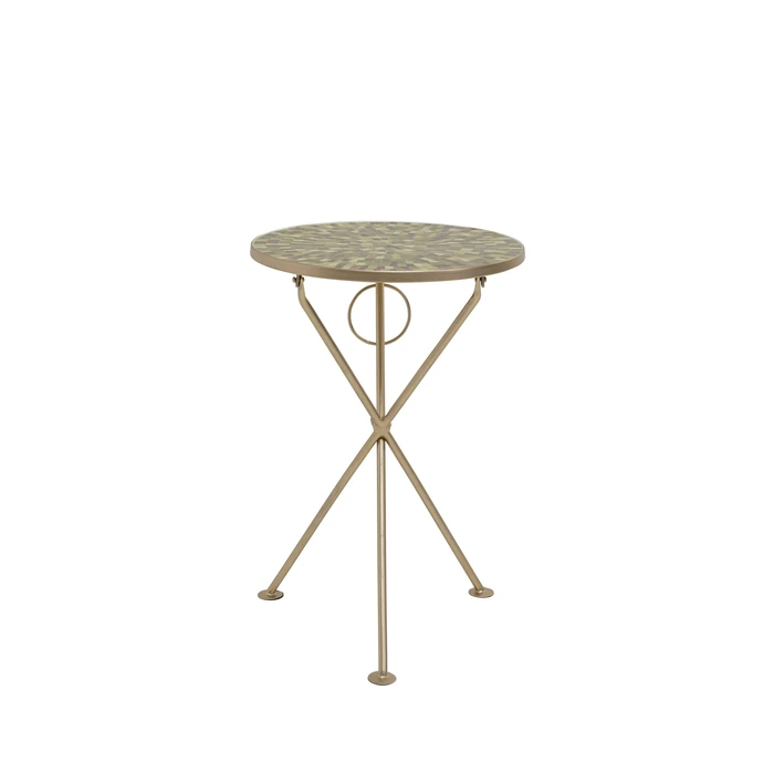 Ett runt sidobord med bordsskiva i handlagd mosaik i olivgröna nyanser. Den svarta metallramen ger bordet stabilitet och en stilren kontrast. Ihopfällbart som en praktiskt klaffbord och kan enkelt skapa mer plats genom att lutas mot en vägg eller hängas upp på väggen. I hopfällbart läge kommer även den vackra olivgröna mosaiken på bordsytan till sin rätt, som en väggdekoration.