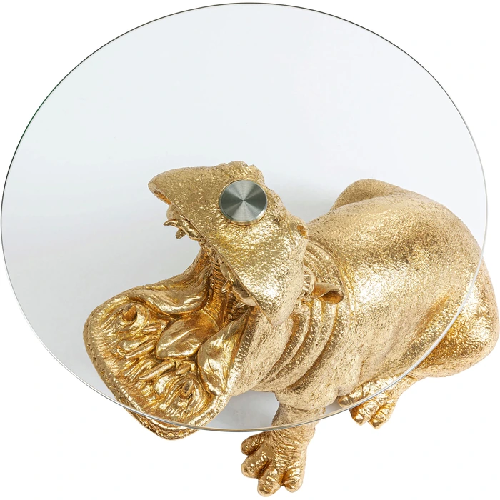 Skulpturalt sidobord med flodhäst i guldfinish och rund glasskiva.