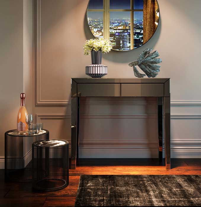 Nätta och sobra små sidobord i två olika storlekar båda med färgat högblankt spegelglas i bordsskivan. Fina att ställa var för sig eller ihop. Finns även i koppar och mässing med klart spegelglas.