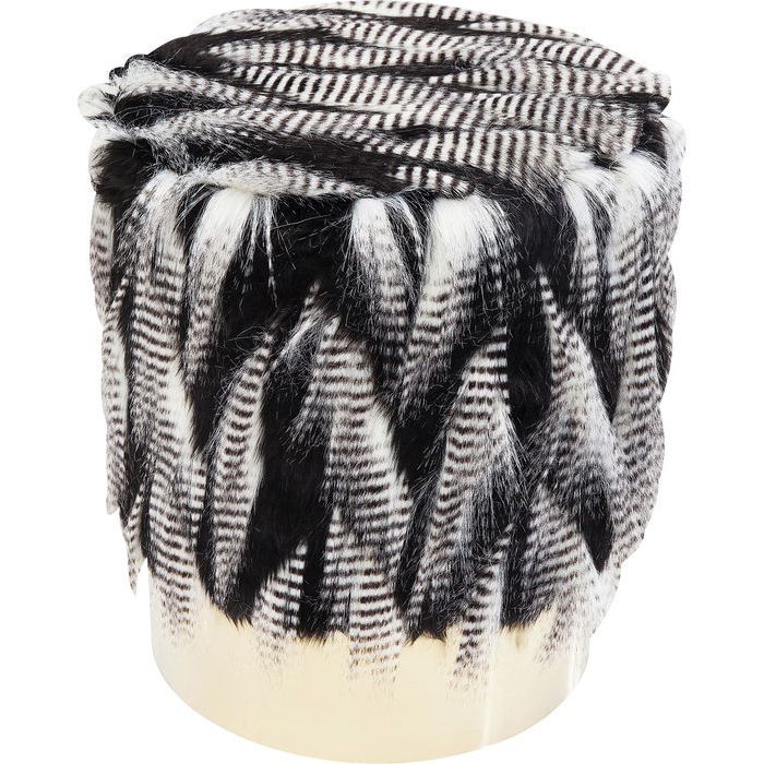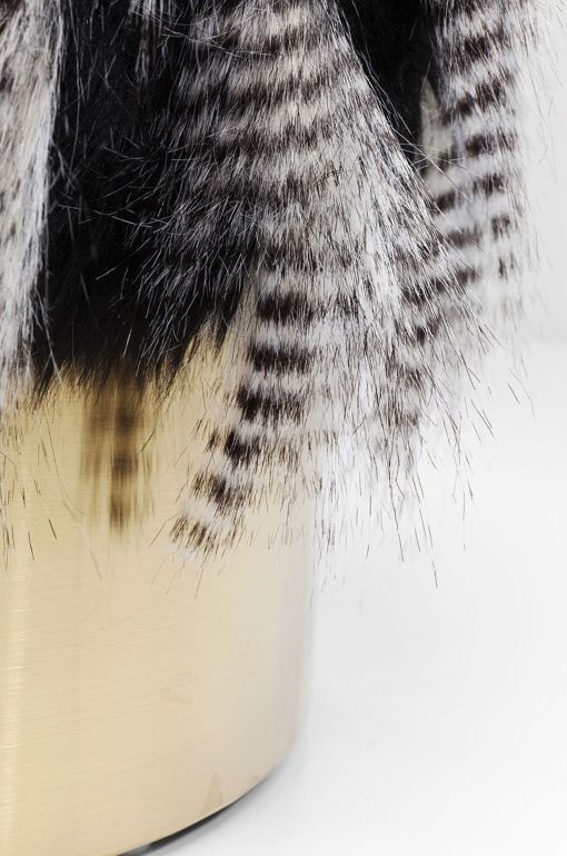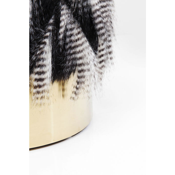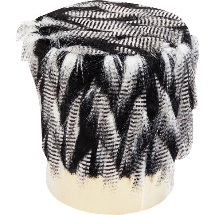 En kaxig och läcker liten sittpuff i svart-vit, långhårig fuskpäls med elegant mässingslist nertill. Sittpuffarna är våra mest populära produkter och finns i flera färger i sammet och även med leopardmönstrad och vit fuskpäls. Pallen är en praktisk liten möbel som ger sittplats åt fler även på ett litet utrymme. Material: Pulverlackat stål, OSB-skiva, skumfyllning, fuskpäls av polyester. Max belastning 120 kg. Mått: Höjd 42 x diam. 35 cm.