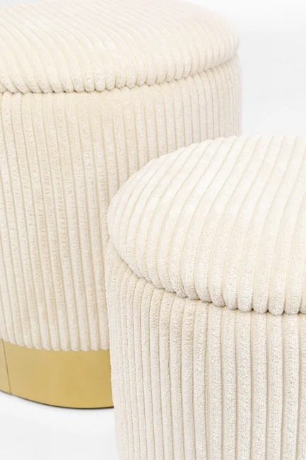 Letar du efter en stilfull och praktisk lösning för att hålla ordning i ditt hem? Detta set med två sittpuffar i en mjuk och krämfärgad nyans är den perfekta lösningen. Med sin eleganta design och sammetslena bredspåriga manchestertyg skapar puffarna en varm och inbjudande atmosfär i vilket rum som helst. Puffarna erbjuder inte bara en bekväm sittplats, utan även en smart förvaringslösning för kuddar, filtar, leksaker eller andra saker du vill hålla utom synhåll. Den avtagbara locket gör det enkelt att komma åt förvaringsutrymmet, medan den robusta basen i rostfritt stål med mässingsbeläggning garanterar stabilitet och hållbarhet. Puffarna, som kommer i två storlekar, passar perfekt i både vardagsrum, sovrum och hall för att skapa en ordnad och stilfull miljö.
