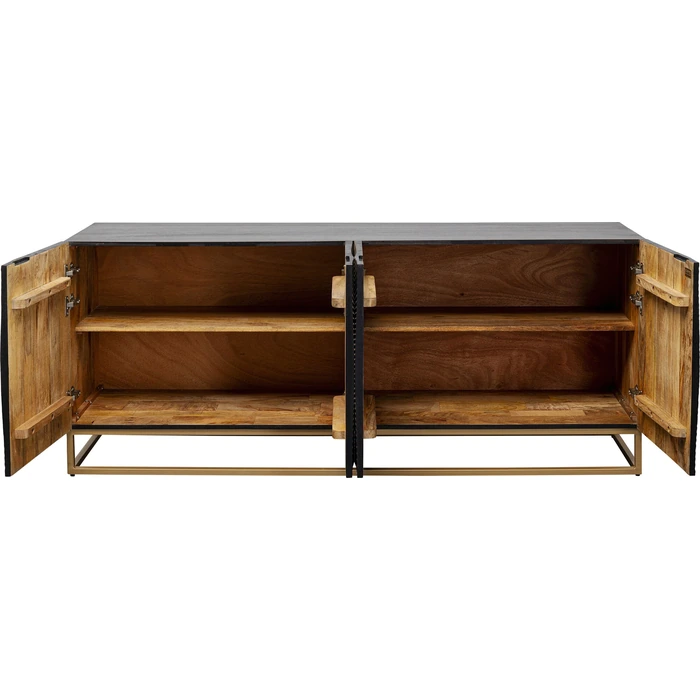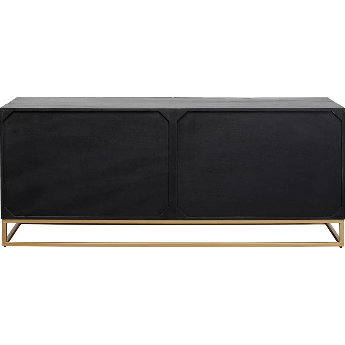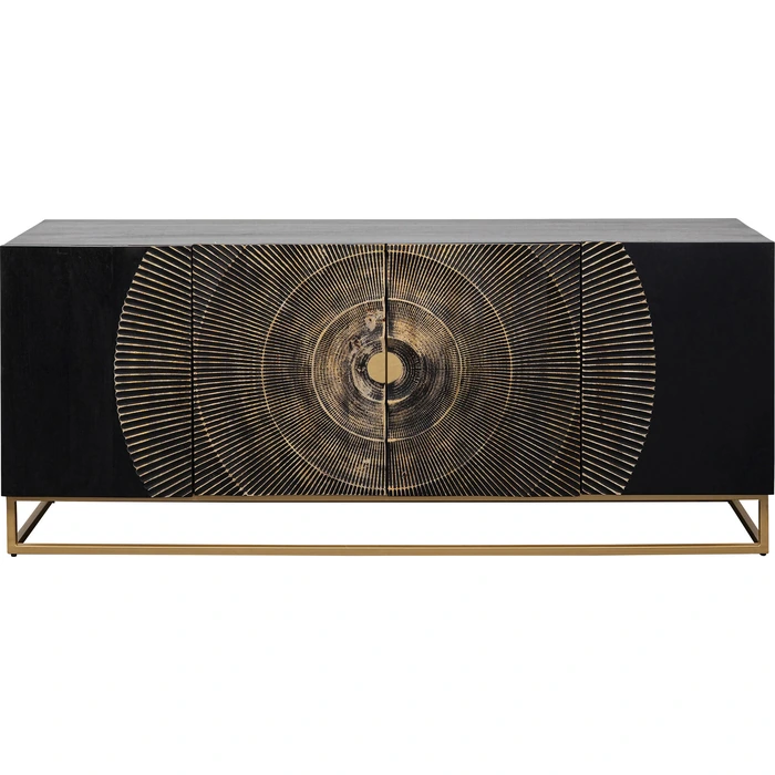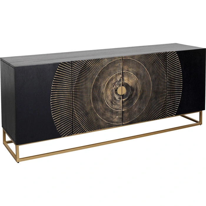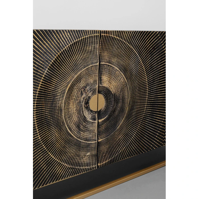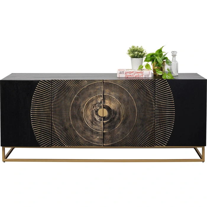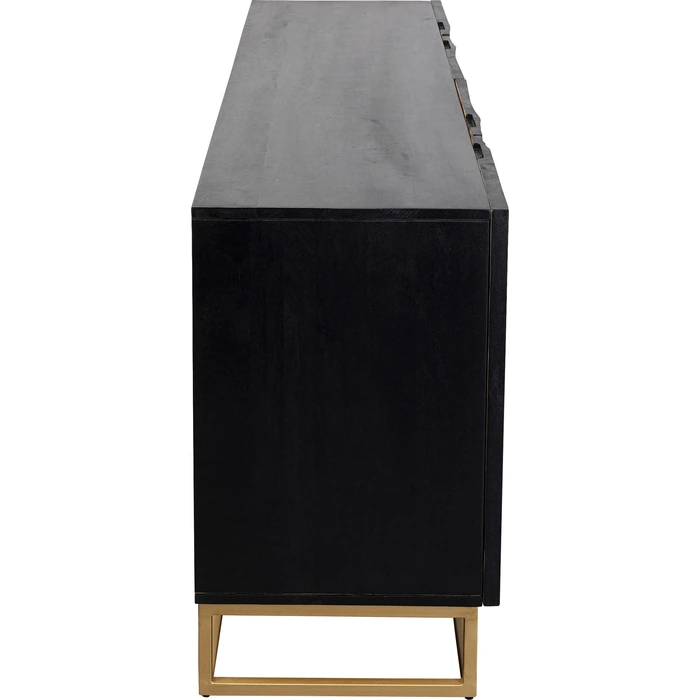 Sideboard i mörkt massivt trä med halvmåneformad 3D-relief och guldfärgad metallram – ett exklusivt statement i hemmet.