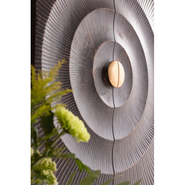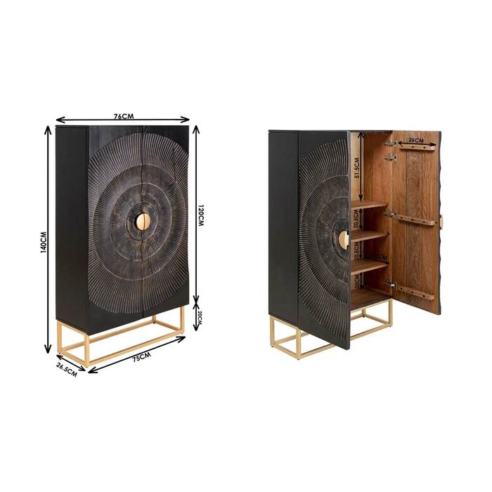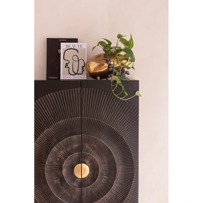 Tillverkat i massivt mangoträ och metall, är Skåp Relief Halvmåne inte bara hållbart och robust, utan också en långsiktig investering i stilren inredning. Dess unika design gör att det fungerar lika bra som förvaringslösning som dekorativ mittpunkt i ditt hem.