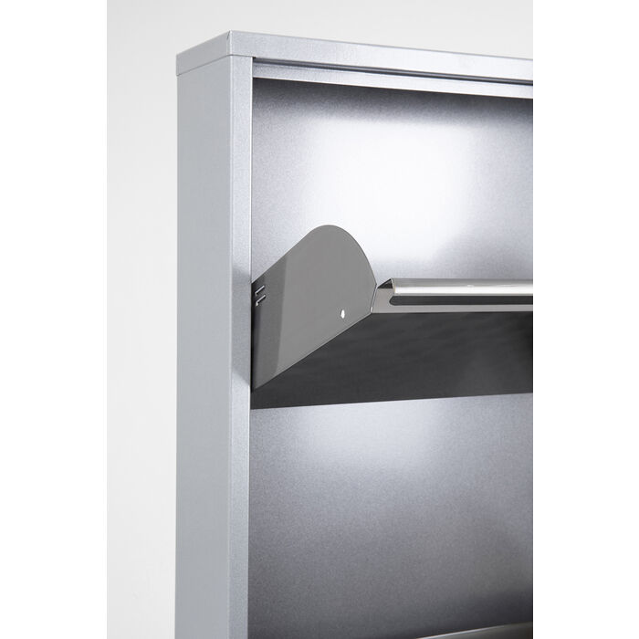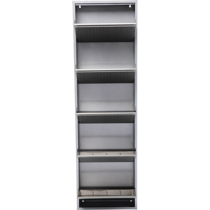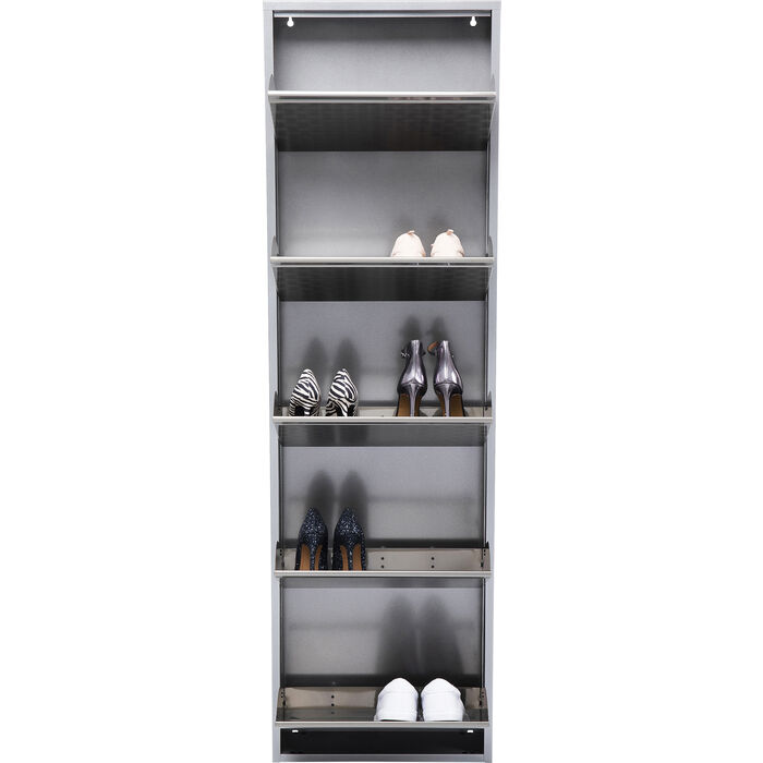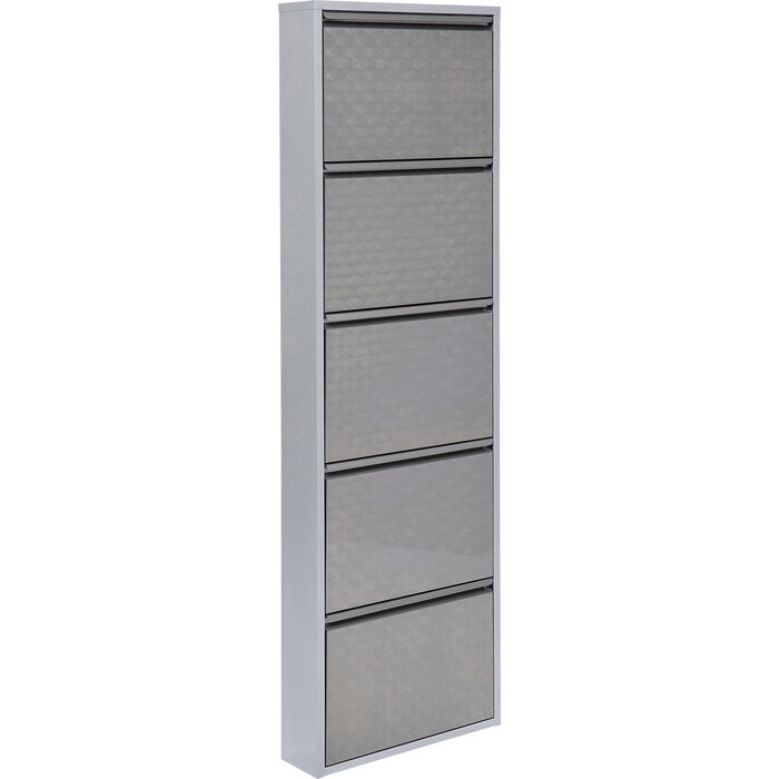 Skoskåp i borstad metall med 5 lådor för skorna. Låddjupet är 32 cm - alltså skornas längd kan vara max 32 cm.