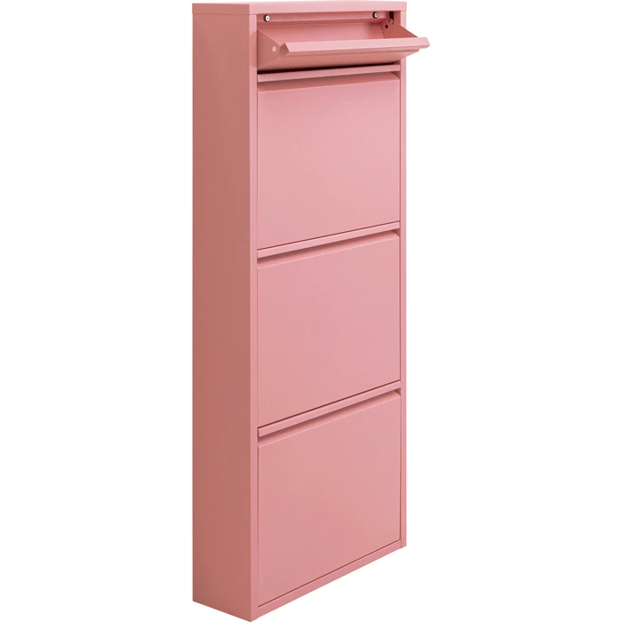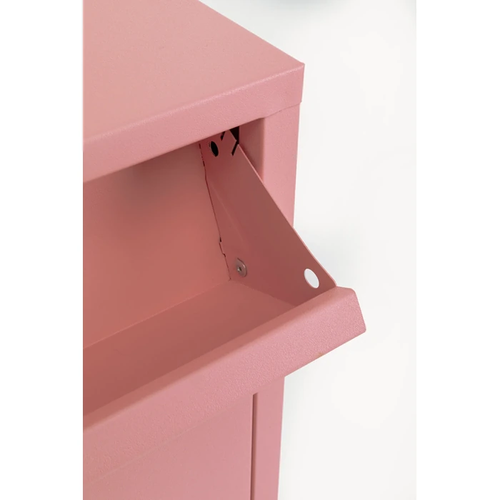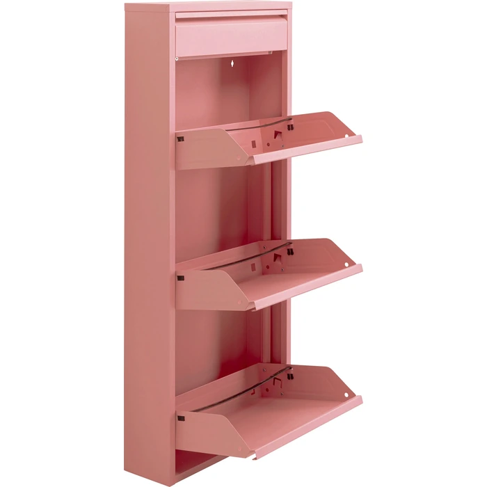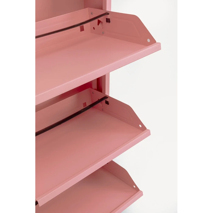 Rosa skoskåp i stål med tre tiltfack och extra låda för småförvaring.