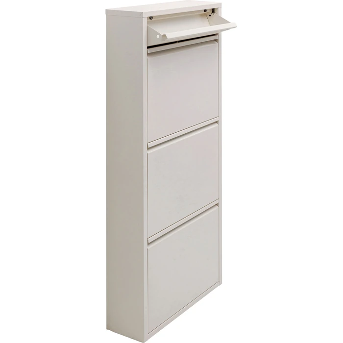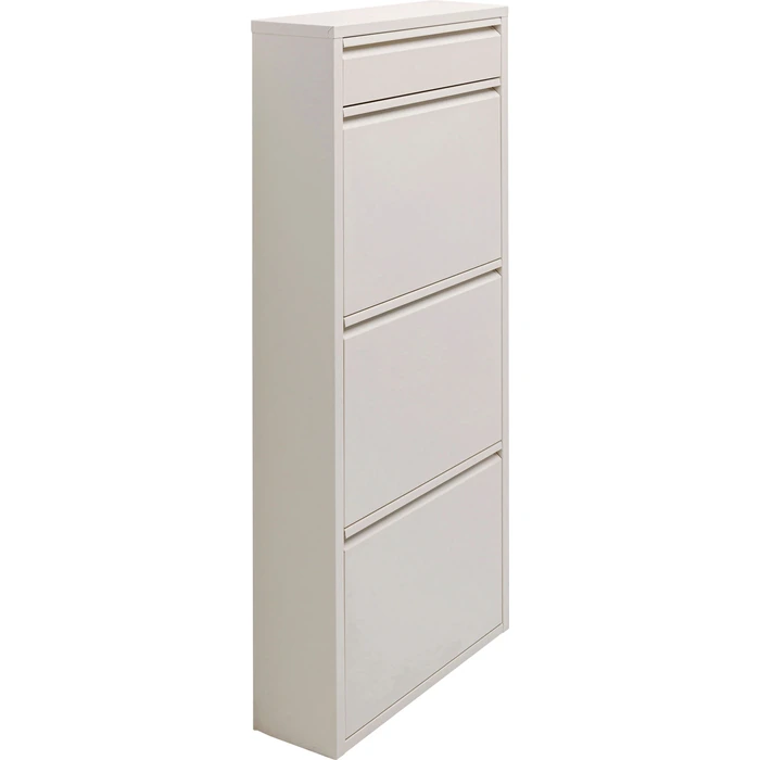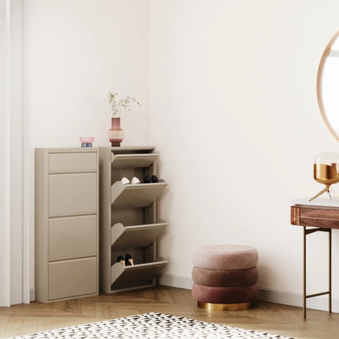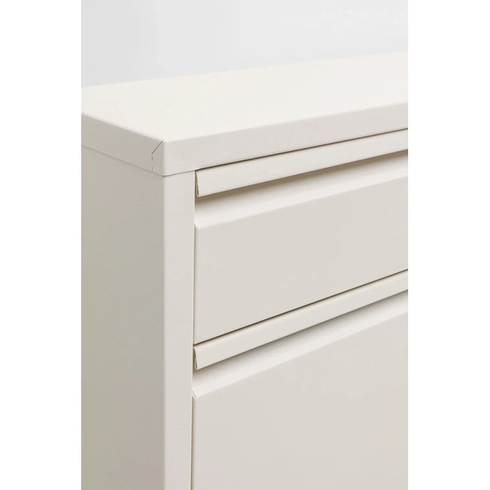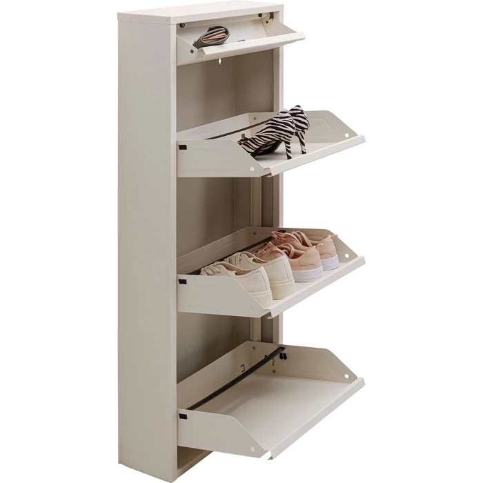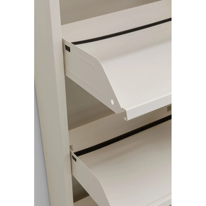 Smal skoförvaring i krämfärgad metall som håller hallen prydlig utan att stjäla utrymme. Tre fällbara fack rymmer minst sex par skor och gör det lätt att få överblick, medan den övre lådan samlar småsaker som nycklar och skovård nära till hands. Den rena fronten och den diskreta kulören smälter in i modernt och minimalistiskt hem – lika praktiskt i hallen som i walk-in.