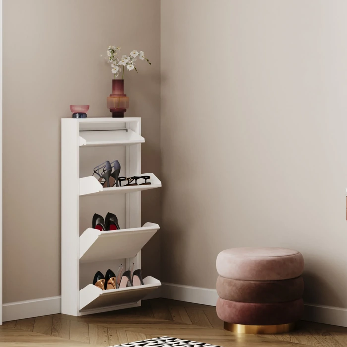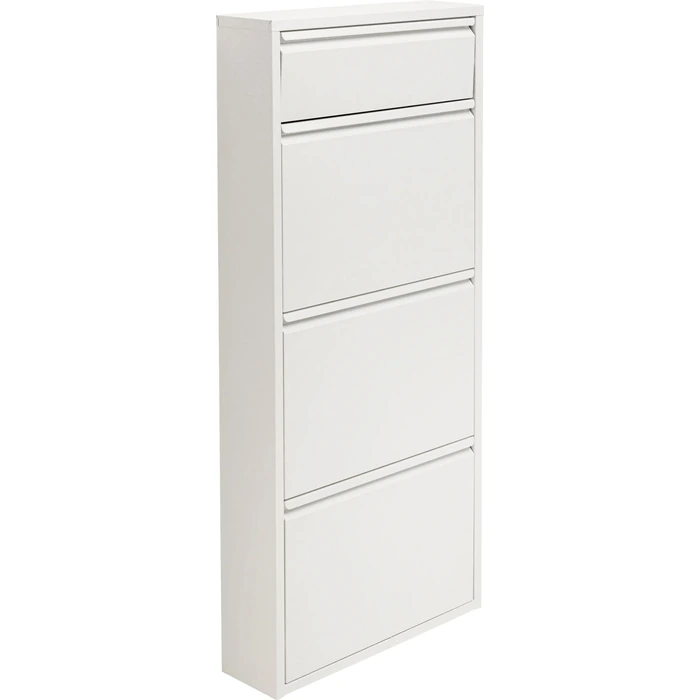 Skoskåp Slim 3+1 – Vit är en smart förvaring som rymmer många skor utan att ta plats. Tre tipplådor organiserar sneakers och klackar, medan den övre lådan håller nycklar och accessoarer nära till hands. Den slanka konstruktionen gör att skåpet passar i smala hallar och mindre utrymmen; flera skåp i rad ger en stilren helhet.