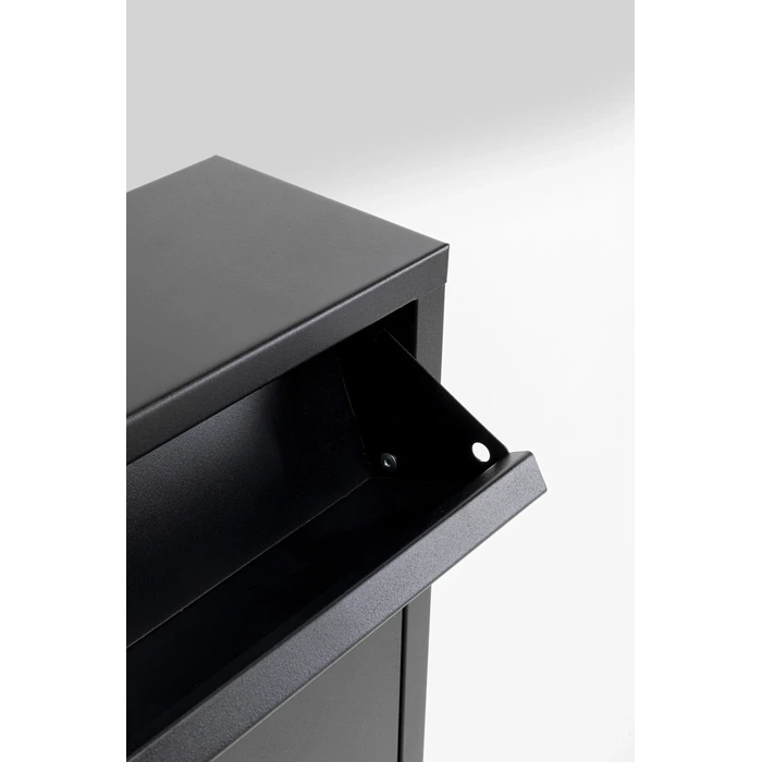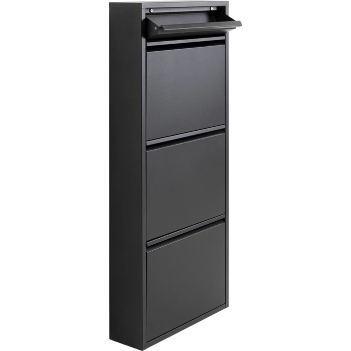 Ett praktiskt skoskåp i svart stål som kombinerar smart design med gott om förvaring. Tre större lådor rymmer skorna i ordning medan den översta mindre lådan passar till nycklar och småsaker.
