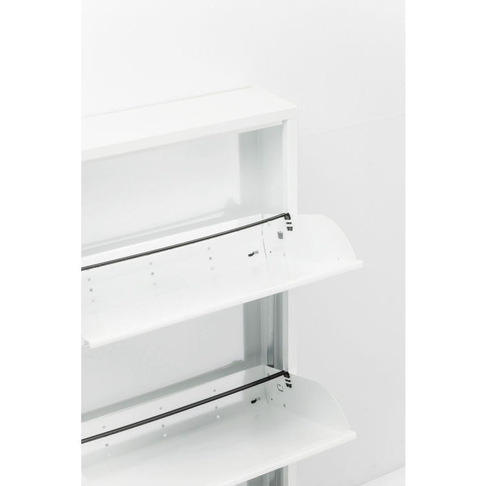 Skoskåpet tar minimalt med plats och rymmer upp till 15 par skor. Design av G Cavallo i prisvärd kvalitet av hårdlackad metall i vitt. Skruvas fast på vägg genom förberedda skruvhål på bakstycket upptill. Skruv medföljer ej. Bredd på varje låda 46 cm. Djupet är 32 cm - alltså skornas längd kan vara max 32 cm. Passar för 2 - 3 par skor per hylla.