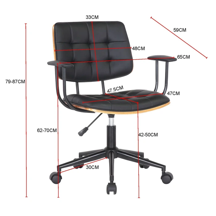 En stilren skrivbordsstol i svart läderlook som förenar komfort och enkel form. Den mjuka sitsen och den slimmade ryggen ger stöd under dagens uppgifter, samtidigt som den diskreta designen passar i de flesta arbetsrum.
