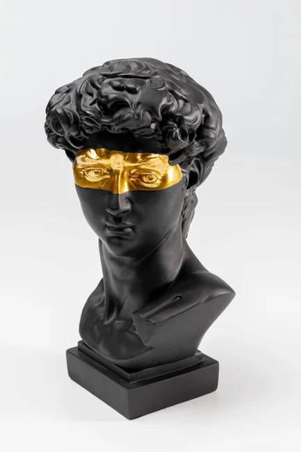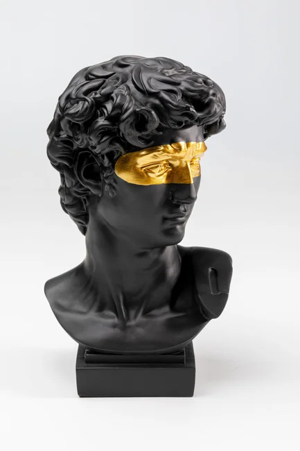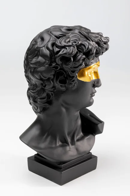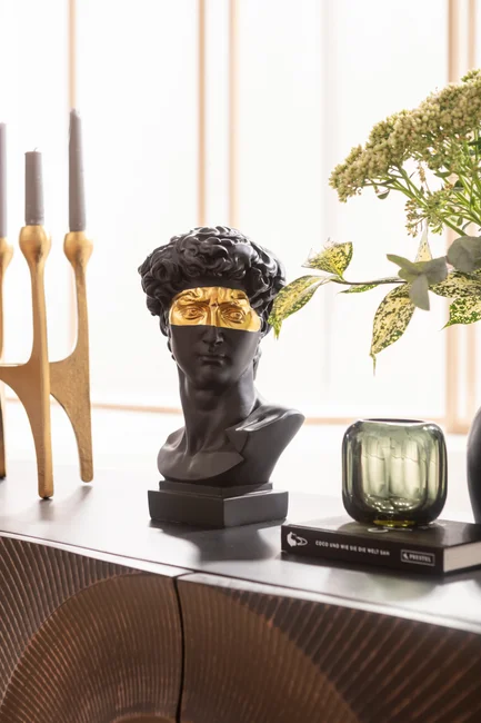 Denna enastående byst liknar en avbildning av en kejsare från det gamla romarriket, förfinad med starkt penseldrag i gyllene guld över ögonen. Detta mästerverk av skulptur och konstverk är inte bara en visuell förförelse utan också en djup symbol för styrka, mystik och förmåga att titta in i själens djup. En dekoration med stark dragningskraft, medan det gyllene penseldraget över ögonen ger den extra styrka och blir ett sant blickfång i inredningen. Guldets glans symboliseras inte bara rikedom och överflöd utan också visdom och insikt, vilket ger denna skulptur en snäppet djupare dimension.