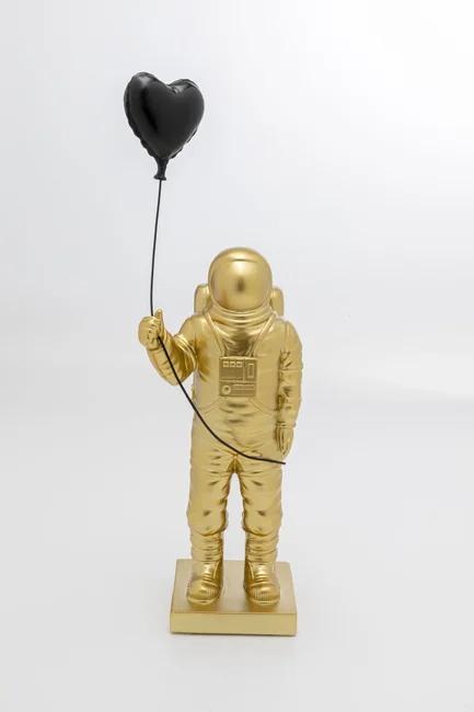 Med stadiga fötter på jorden står denna extraordinära skulptur av en astronaut med en hjärtformad ballong i svart. Detta konstverk är mer än bara ett dekorobjekt; en dekoration som kan symbolisera utforskning, nyfikenhet, frihet och de gränslösa möjligheterna som väntar bortom vårt eget universum. Eller är det en symbol för de okända äventyr som väntar? En metafor för de outgrundliga mysterierna i universum? Det är upp till dig att tolka, vilket gör varje betraktare till en del av konstens berättelse.