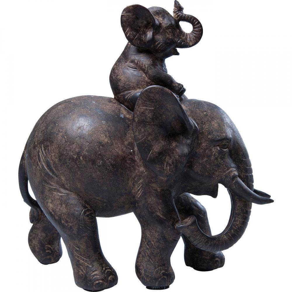 Fin inredningsdetalj av glada elefanter på tur. Elefanten är en symbol för visdom samt familjesammanhållning och här blir det extra tydligt med elefantbebisen som bärs av sin förälder. Dekorationen passar bra som stilleben bland vintage-böcker, ljusstakar, skålar m.m.