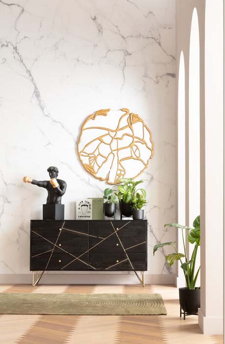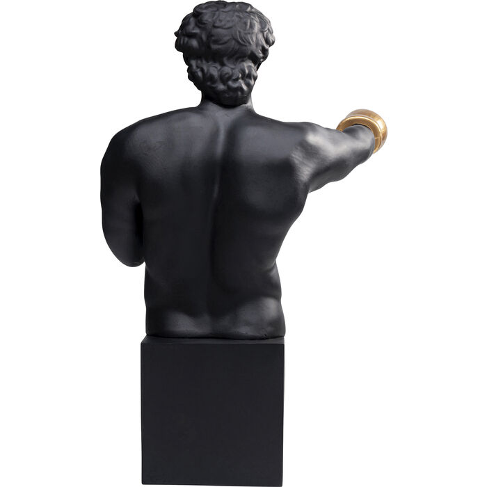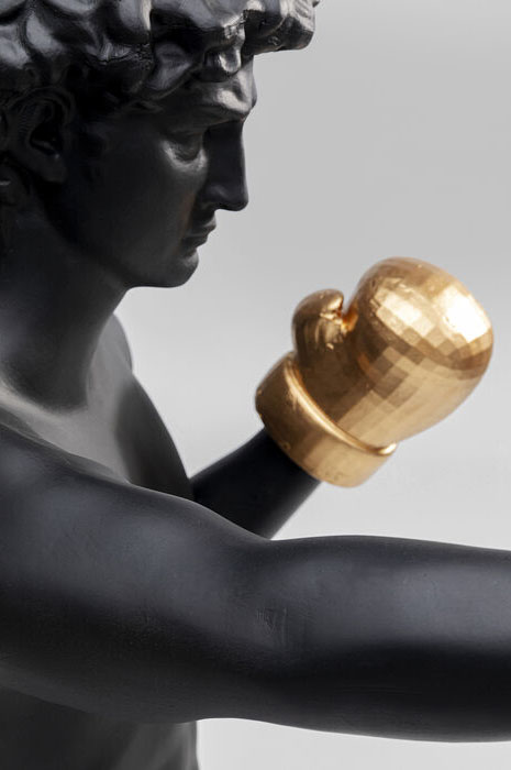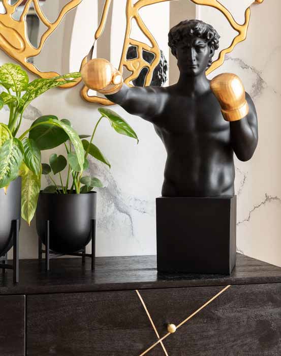 En skulptur med inspiration från olympiska spelen i antikens Grekland, här i modern design för dig som söker udda, spännande inredning. Skulpturen är en eye-catcher i matt svart finish och guldfärgade boxerhandskar. Boxaren står som vinnare på stilrent svart podie. Lägg märke till skulpturens storlek!