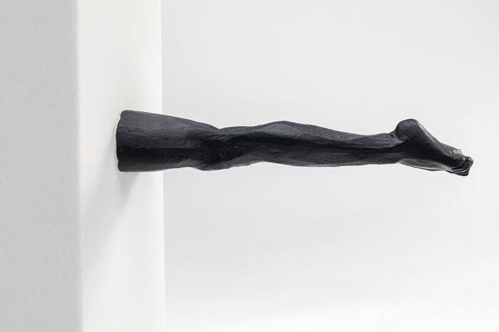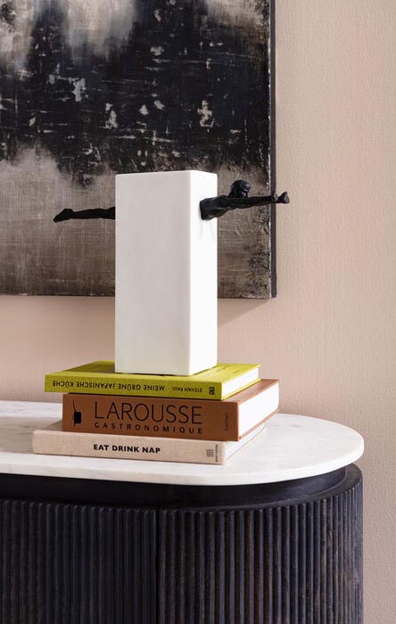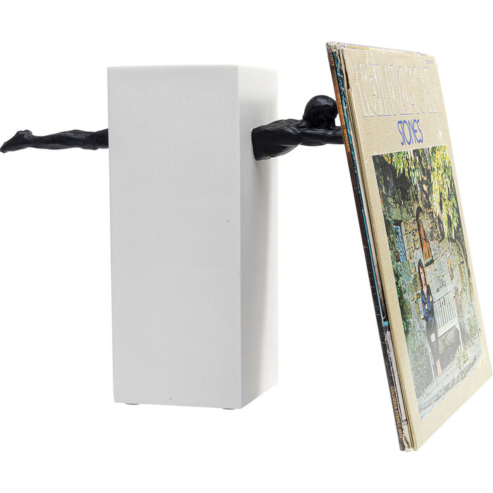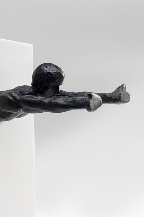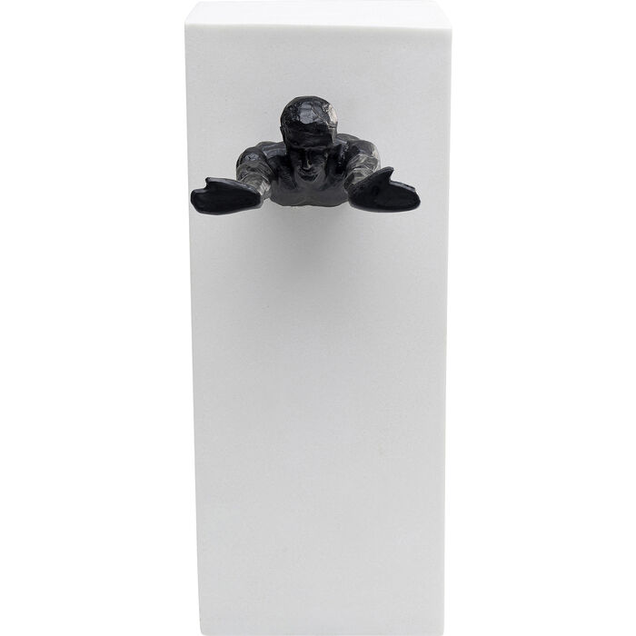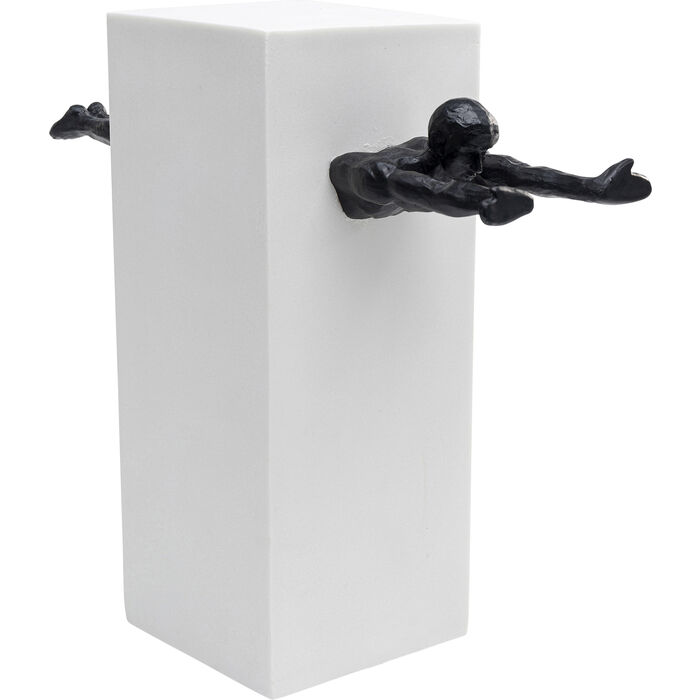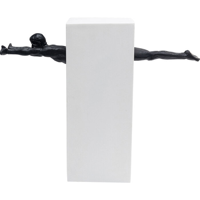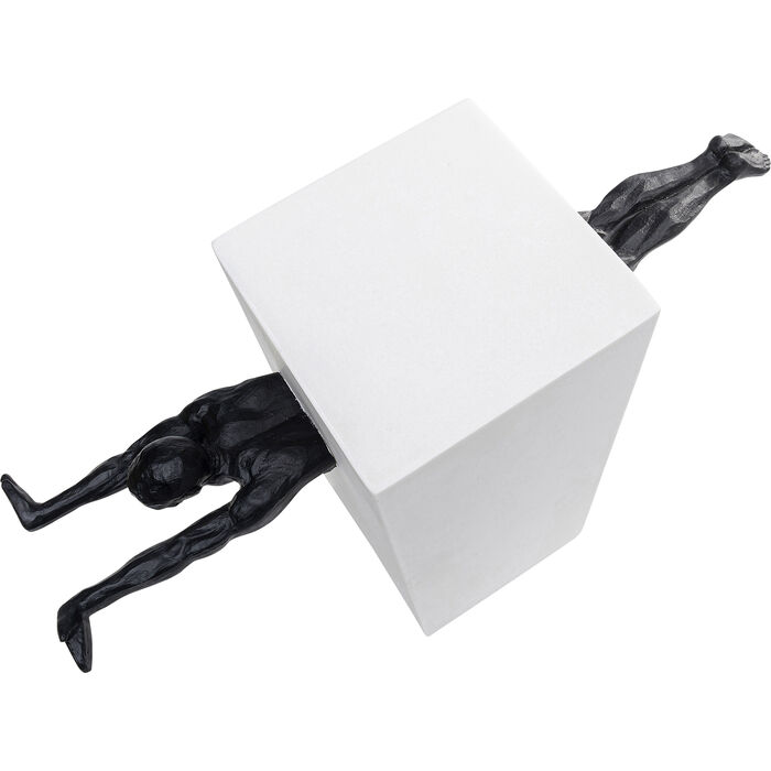 En modern och mycket stilren skulptur i vitt och svart med den spänstige mannen som flyger genom kuben. Läcker inredningsdetalj i ett fönster, på ett konsolbord eller som del i ett stilleben.