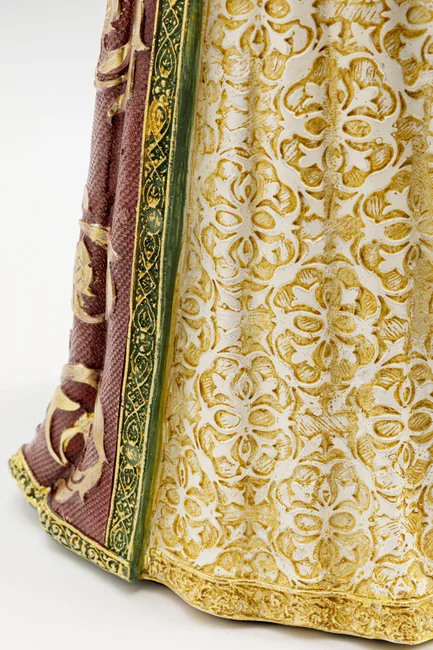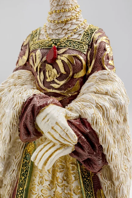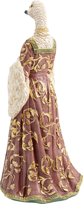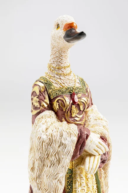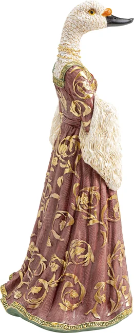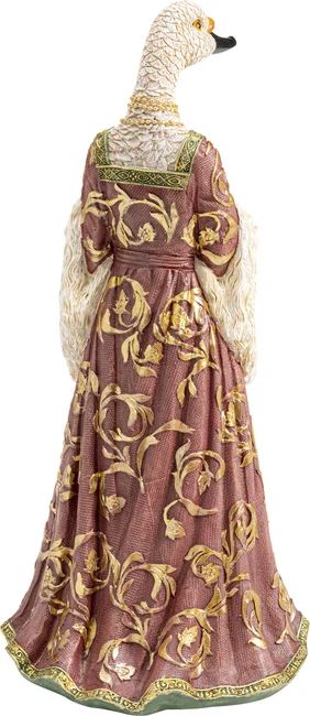En kunglig skulptur av en elegant ankdam som bär upp en smakfull, mörk, dämpad grårosa klänning med vackra detaljer i guld, gräddvit och grönt och pärlsmycke med röd sten.