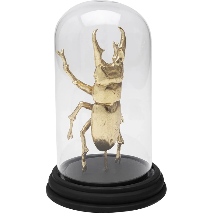 Skulptur Hercules Beetle 20 cm är en dekorativ och detaljrik skalbaggesskulptur som står under en klar glaskupa. Den skimrande gyllene finishen kontrasterar elegant mot den djupsvarta basen och skapar ett uttryck som påminner om klassiska kuriosakabinett.