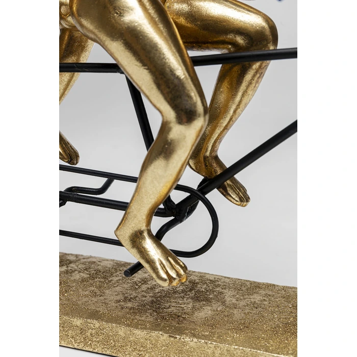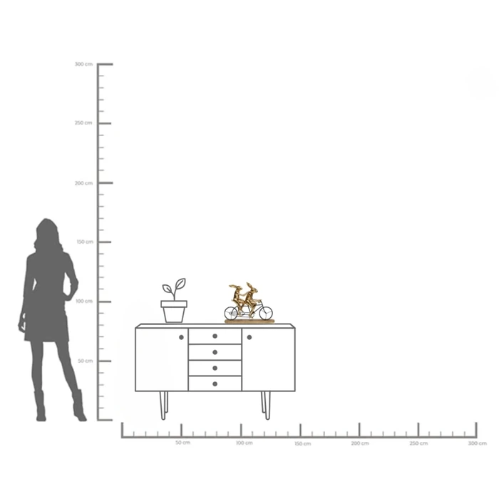 De gyllene kaninerna måste trampa i samma takt – annars går det inte! Alternativt: teamwork gör allt enklare. Ett underbart budskap som denna kaninskulptur förmedlar, oavsett om den ges som bröllopsgåva eller som en spontan present till någon du tycker om. Och det är inte bara budskapet som imponerar – även designen är ett riktigt blickfång. De charmiga kaninerna på sin tandemcykel sprider glädje och värme, samtidigt som de symboliserar gemenskap och lycka. Skulpturen är tillverkad i massiv gjuten sten och stål, monterad på en stabil bas, vilket ger den både tyngd och elegans. Ett dekorativt konstföremål som gör sig perfekt på en byrå, hylla eller sideboard och tillför en lekfull och kärleksfull känsla i hemmet.